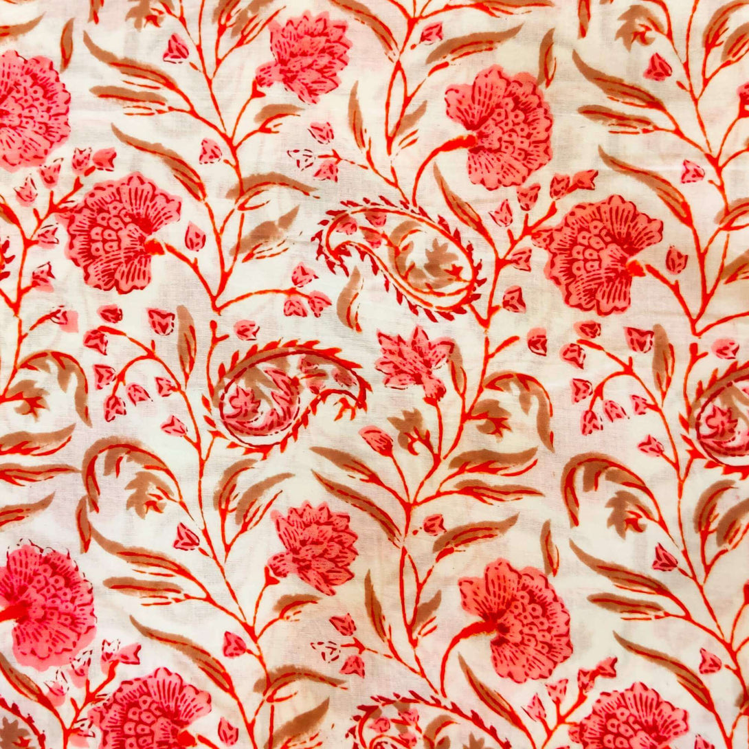 Pure Cotton Jaipuri White With Maroon Peach Beige Flower And Kairi Jaal Hand Block Blouse Print Fabric ( 1 meter )