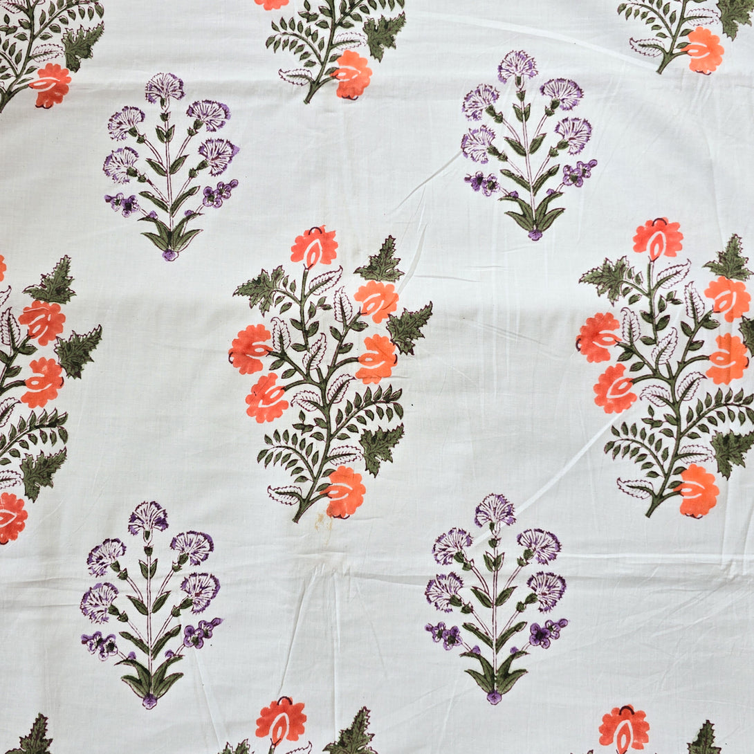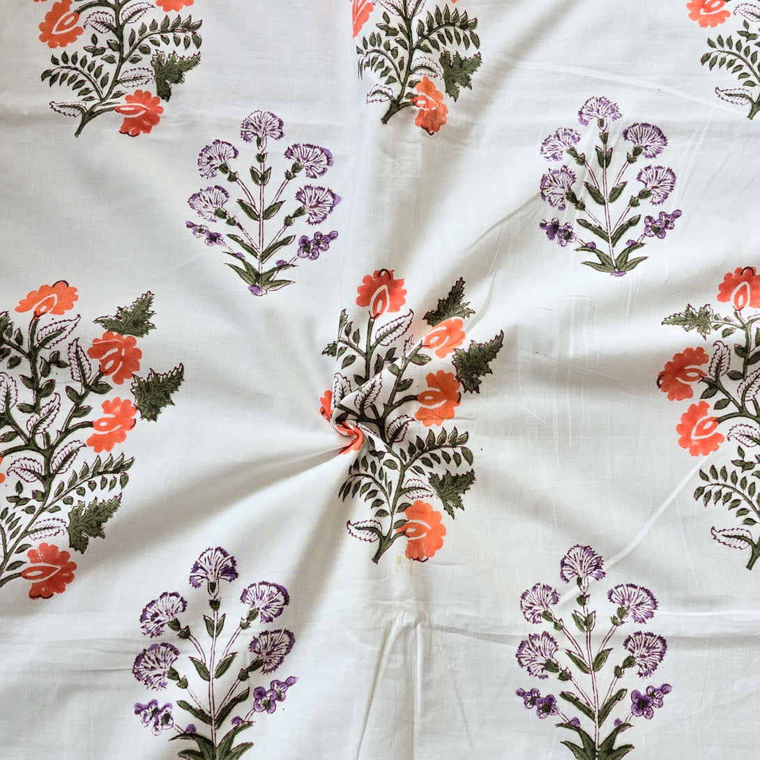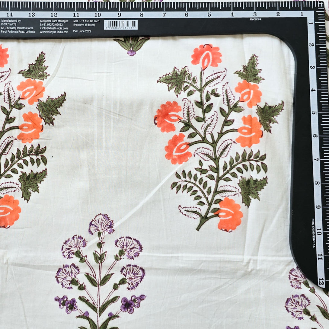 Pure Cotton Jaipuri White With Orange And Purple Big Flower Motif Hand Block Print Fabric