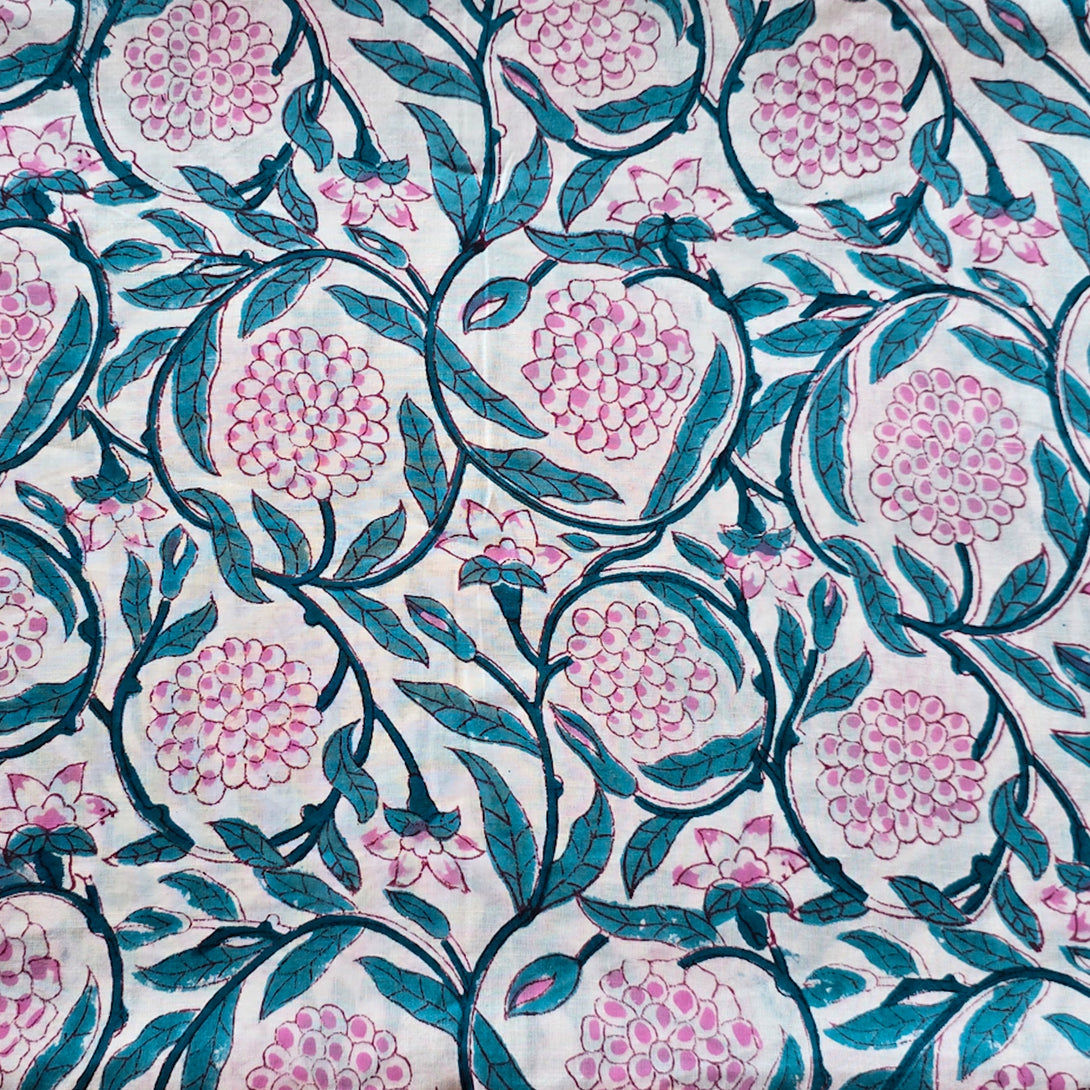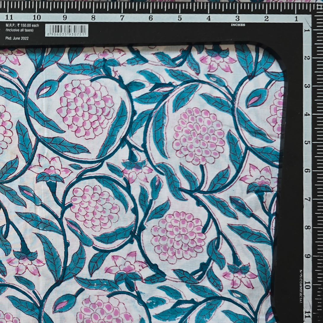 Pure Cotton Jaipuri White With Pink and Teal Flower Jaal Hand Block Print Fabric