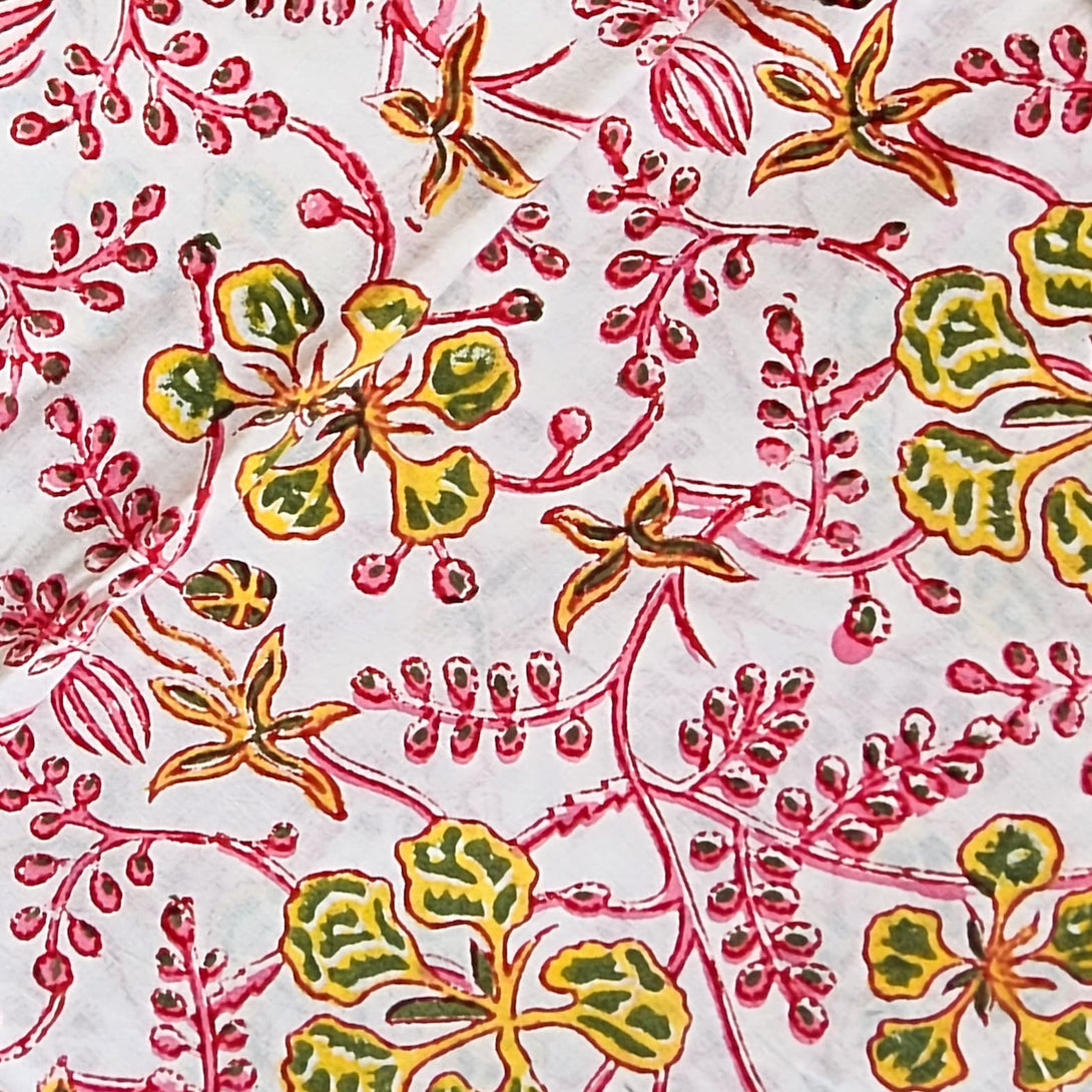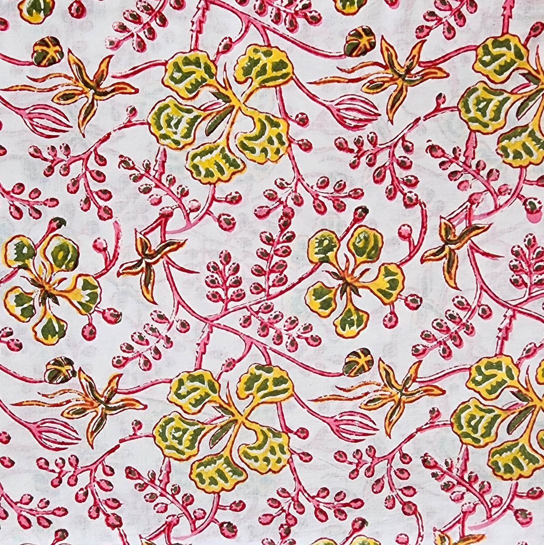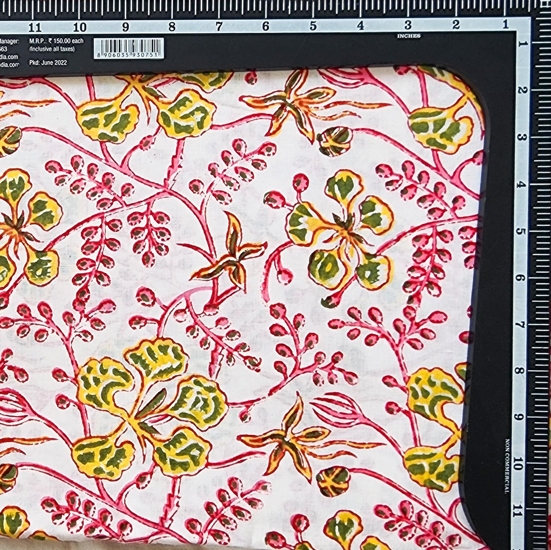 Pure Cotton Jaipuri White With Pink Yellow And Green Flower Jaal Hand Block Print Fabric