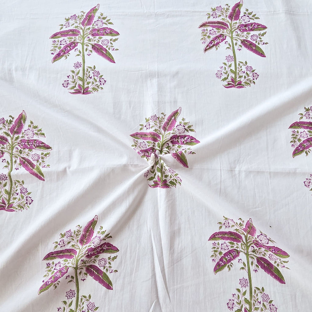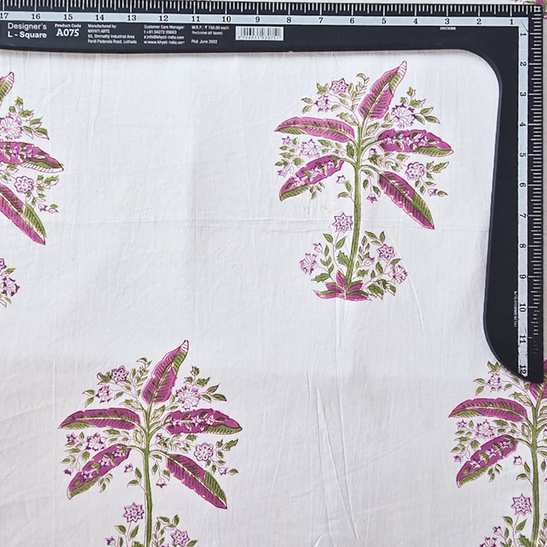 Pure Cotton Jaipuri White With Purple Plant Motif Hand Block Print Fabric