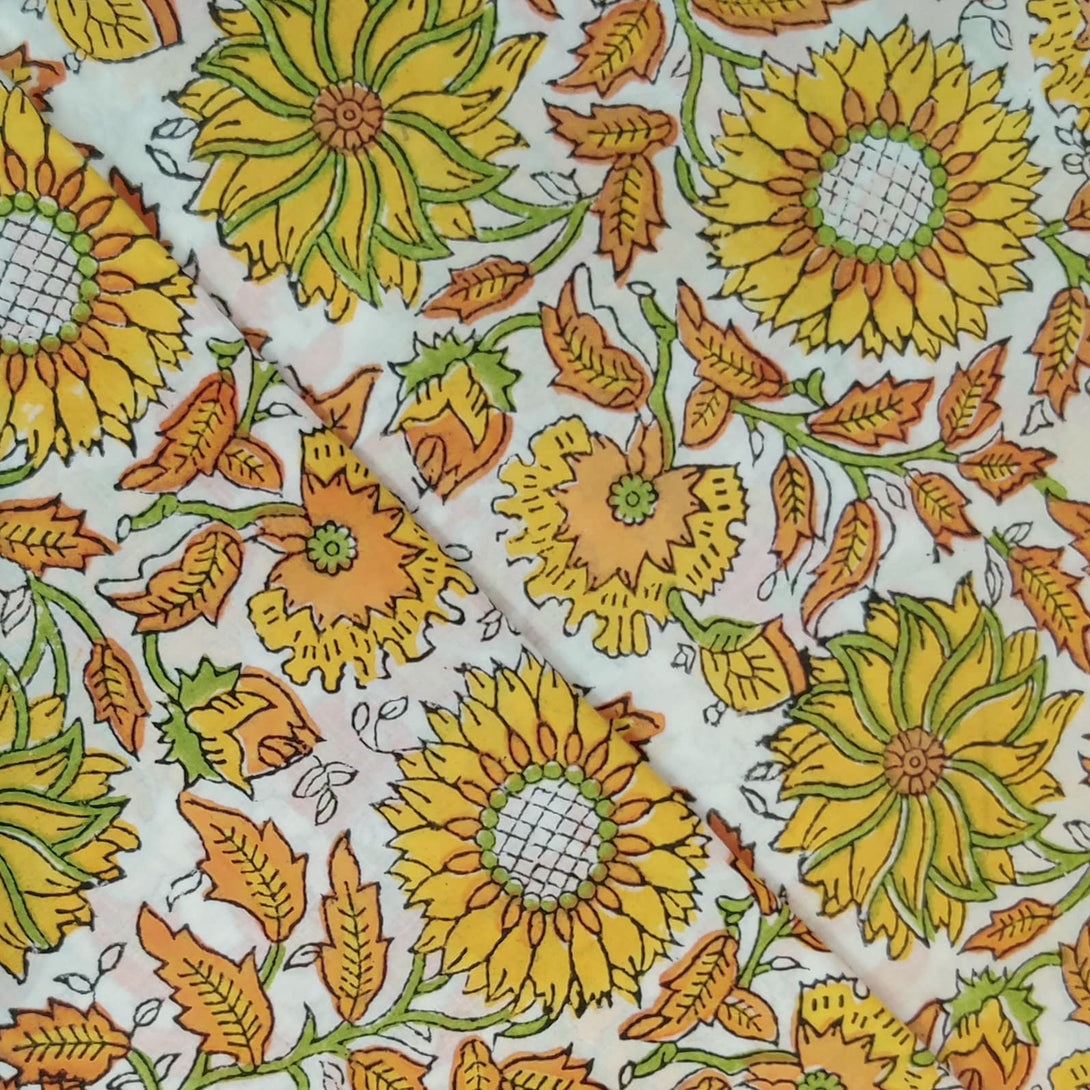 Pure Cotton Jaipuri White With Shades Of Yellow Sun Flower Hand Block Print Fabric