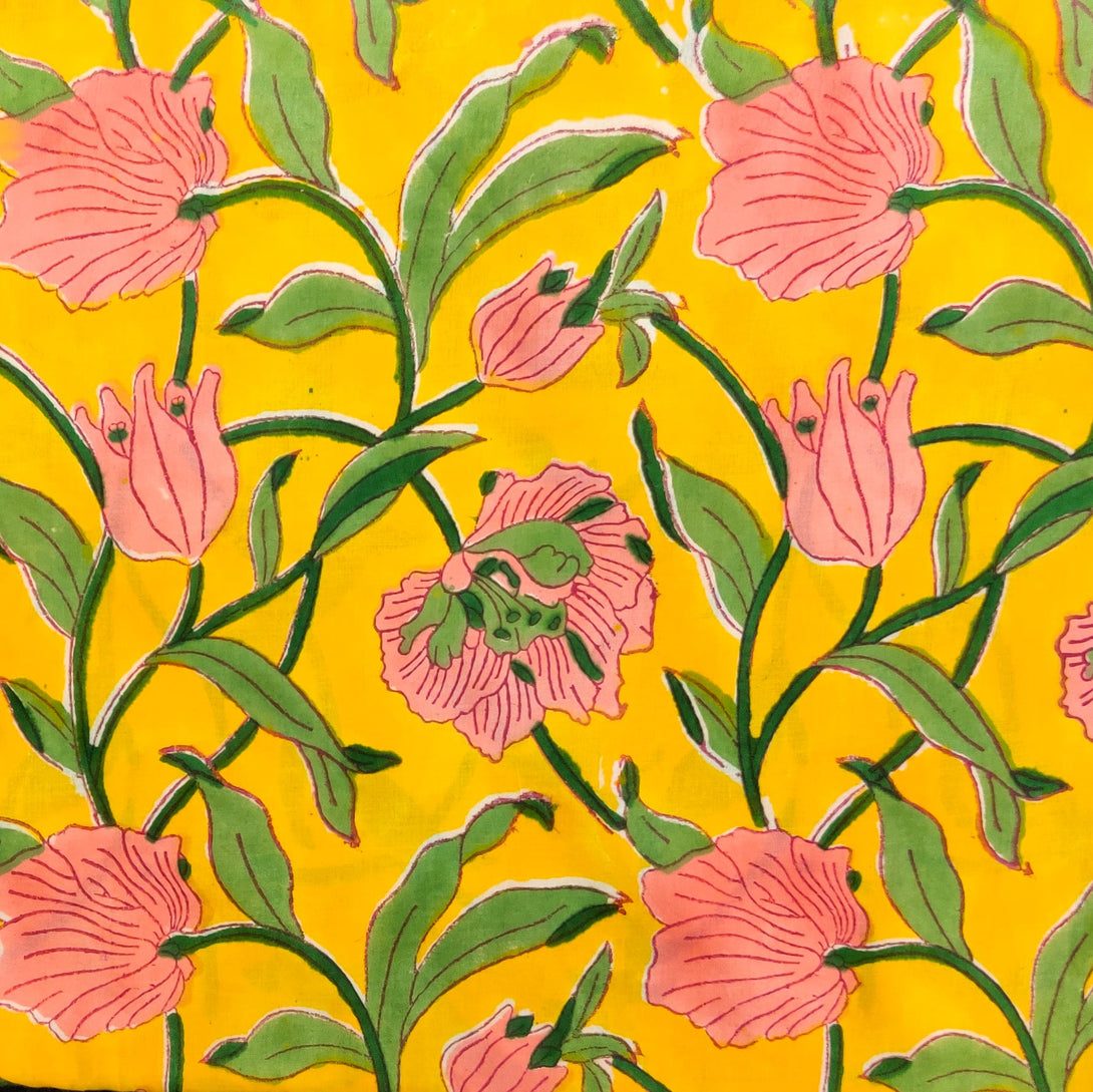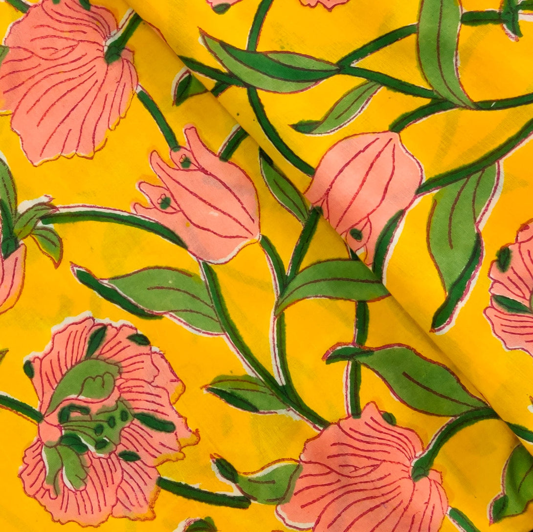 Pure Cotton Jaipuri Yellow With Pink Wild Tulip Jaal Hand Block Print Fabric