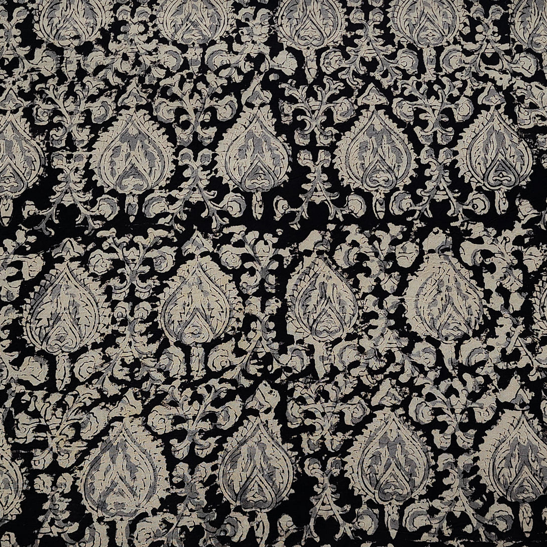 Pure Cotton Kalamkari Black With Cream Heart Flower Jaal Hand Block Print Fabric in