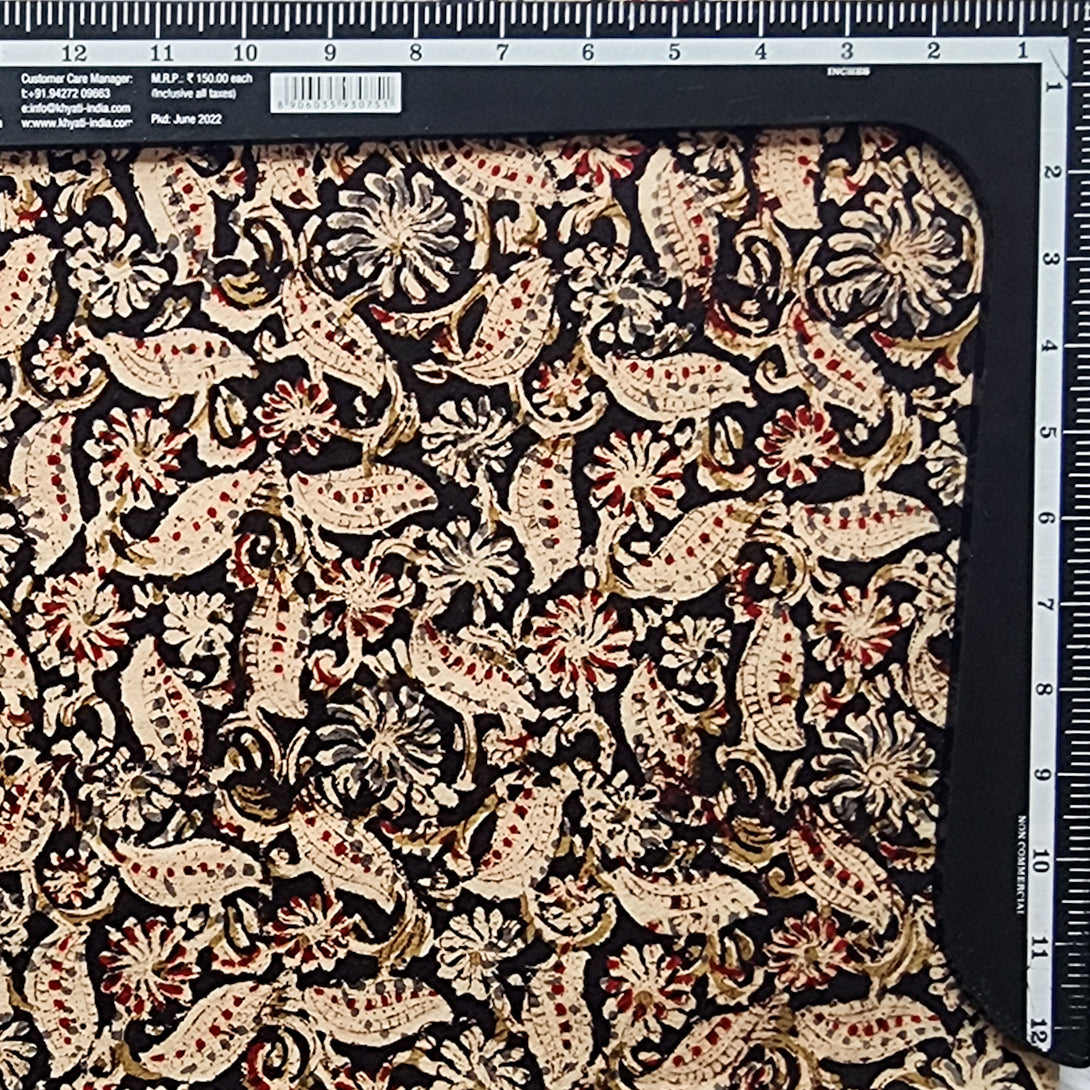 Pure Cotton Kalamkari Black With Grey With Red Leaves And Flower Jaal Hand Block Print Fabric