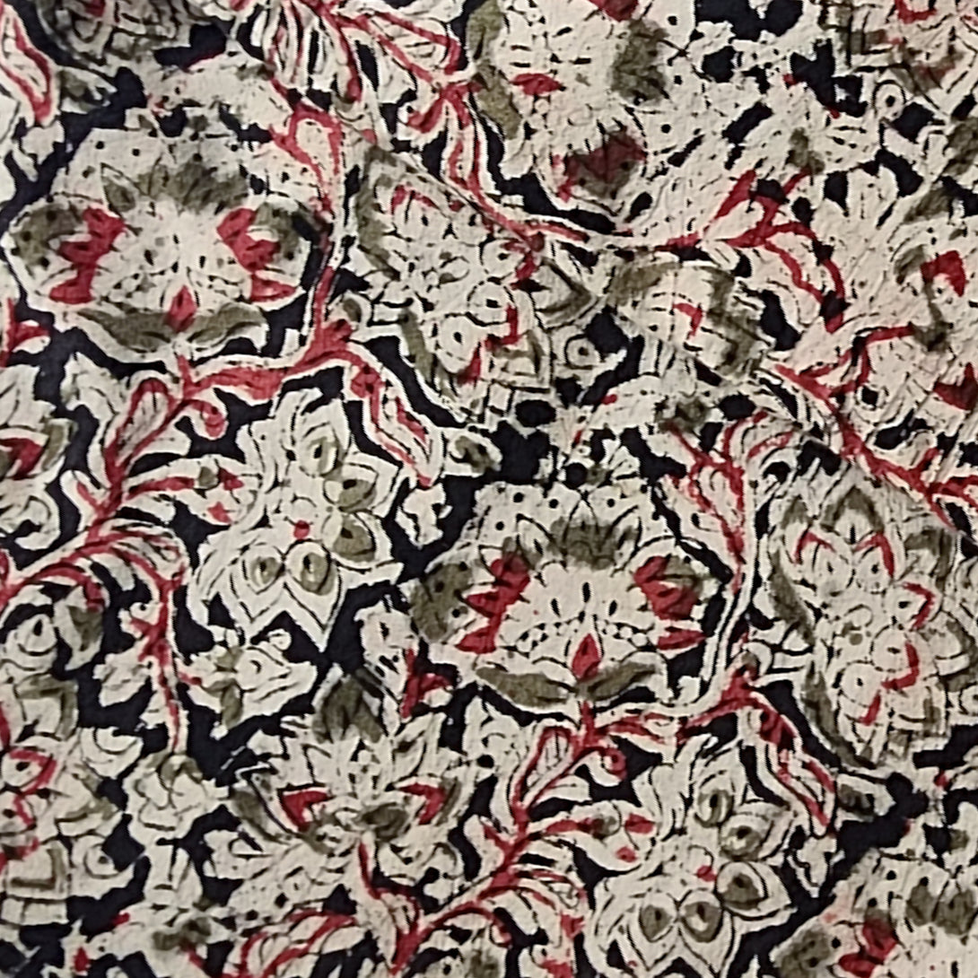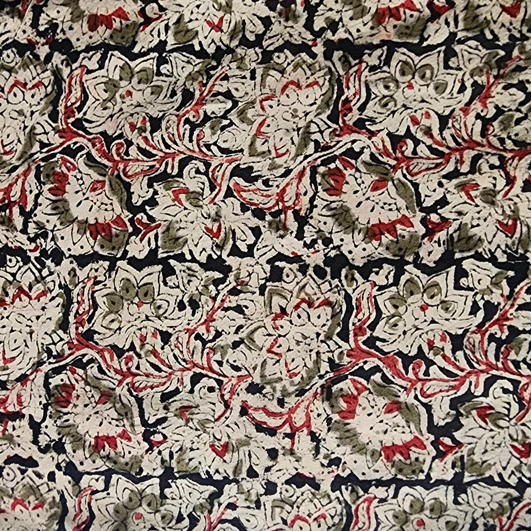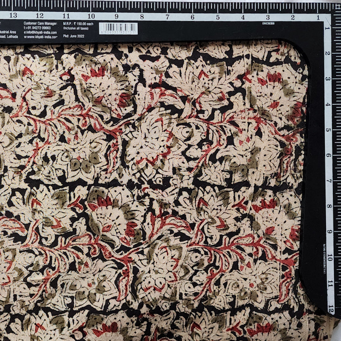 Pure Cotton Kalamkari Black With Mehandi Green Flower Jaal Hand Block Print Fabric