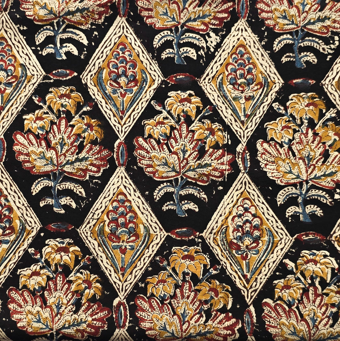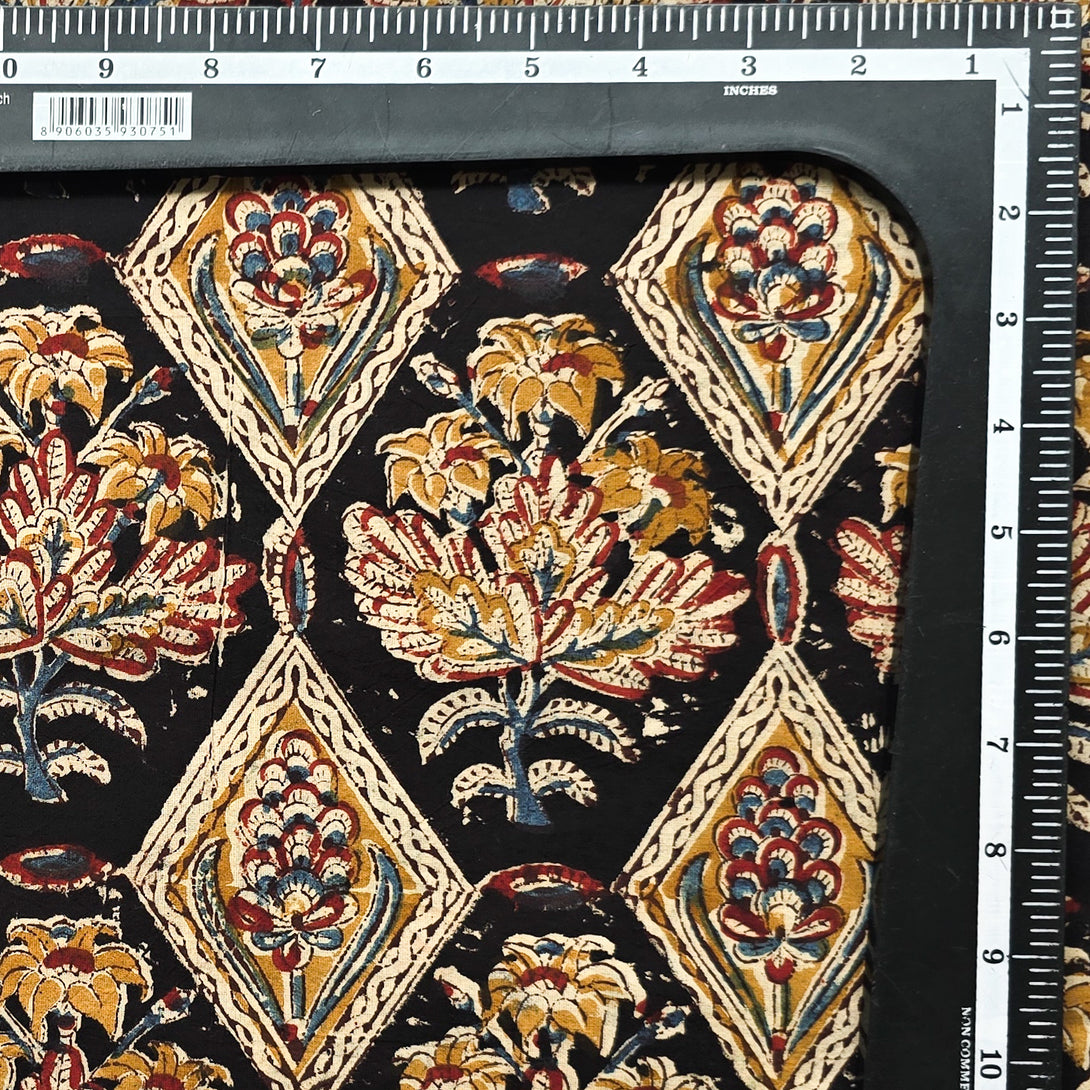 Pure Cotton Kalamkari Black With Mustard Intricate Design Hand Block Print Fabric
