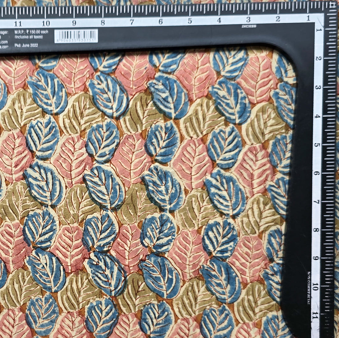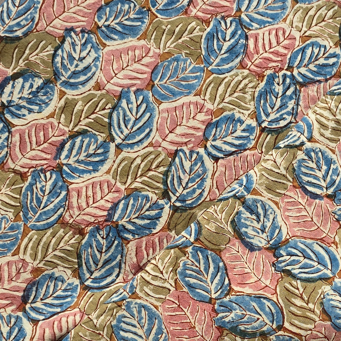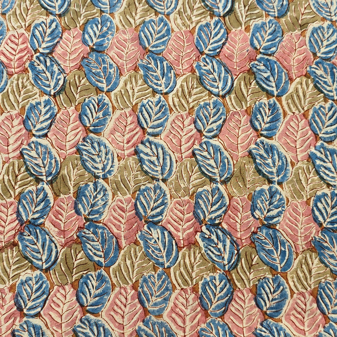 Pure Cotton Kalamkari Blue With Pink And Green Leaves Hand Block Print Fabric