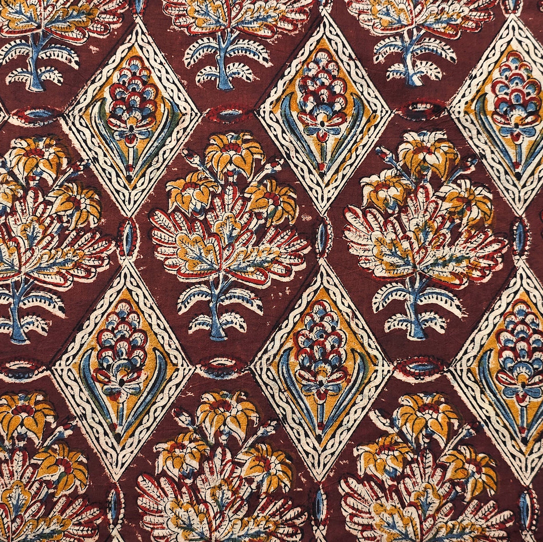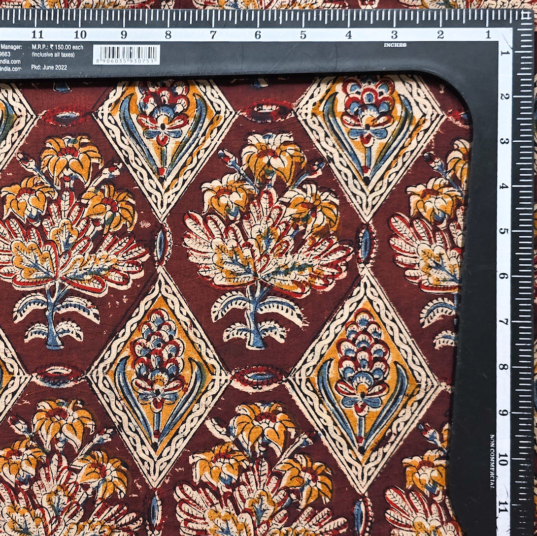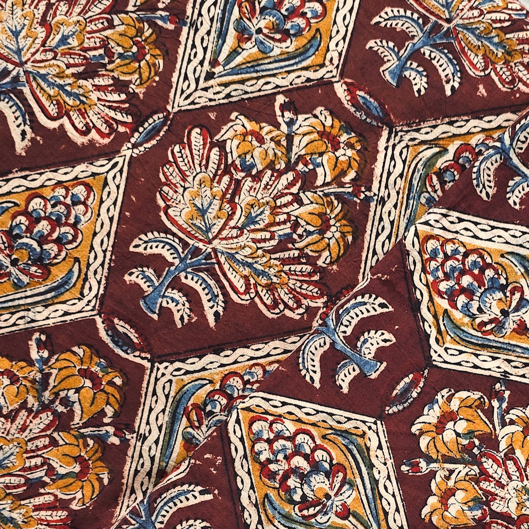 Pure Cotton Kalamkari Dark Brown With Mustard Intricate Design Hand Block Print Fabric