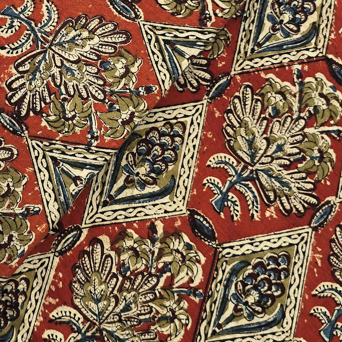 Pure Cotton Kalamkari Red-Orange With Green Intricate Design Hand Block Print Fabric
