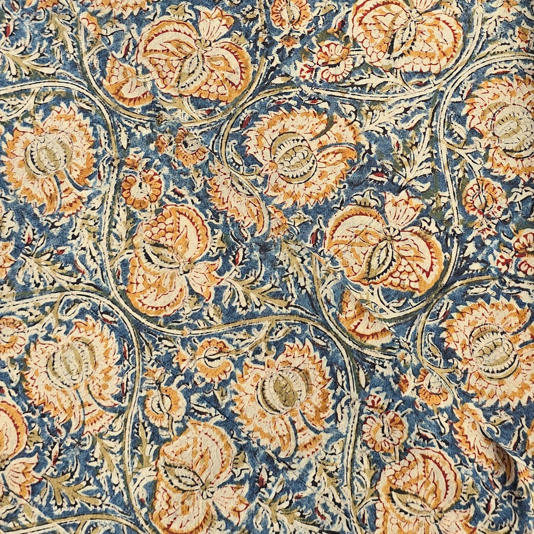 Pure Cotton Kalamkari Rust Blue With Musatrd Flower Jaal Hand Block Print Fabric
