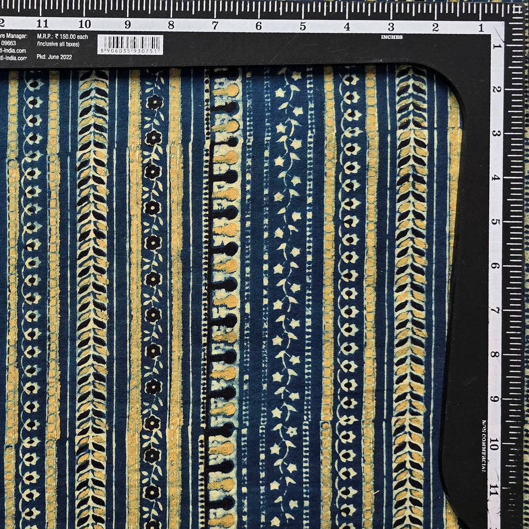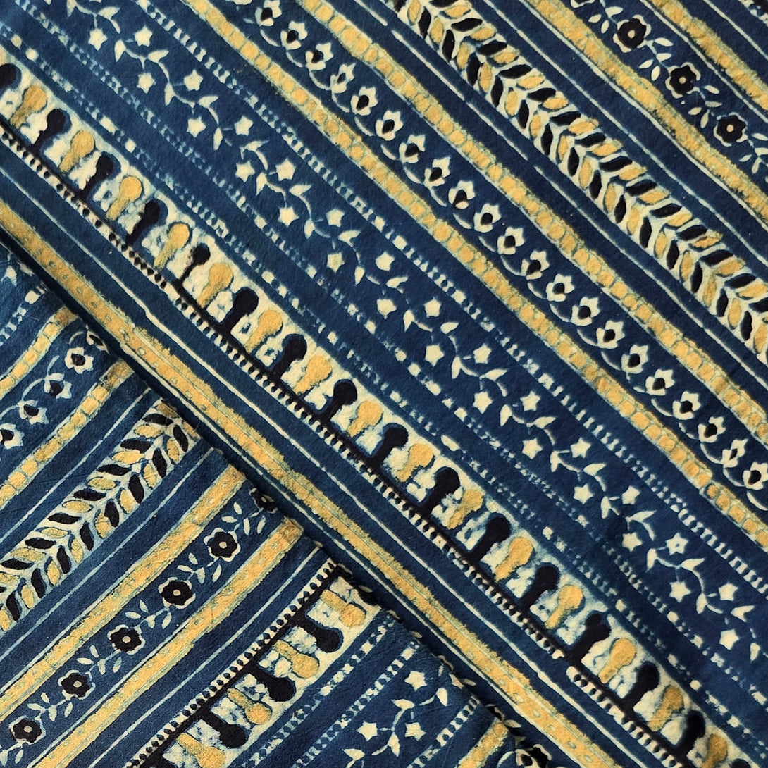 Pure Cotton Teen Kaam Ajrak Rust Blue With Design Stripes Hand Block Print Fabric
