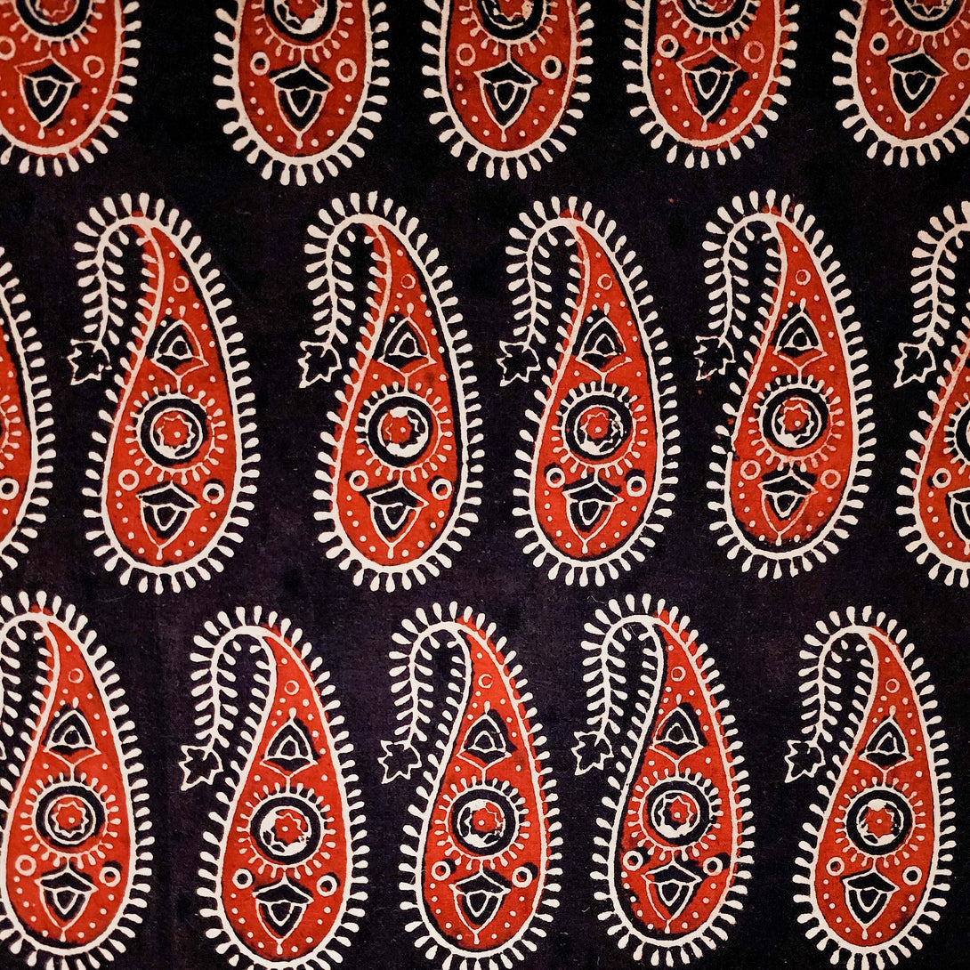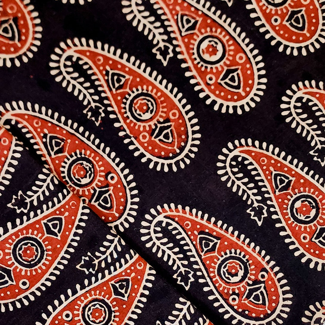 Pure Cotton Vegetable Dyed Ajrak Black With Big Rust Kairi Hand Block Print Fabric