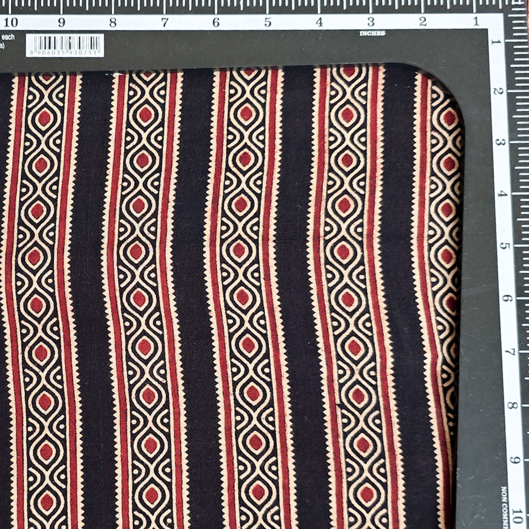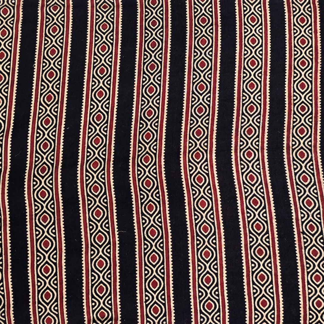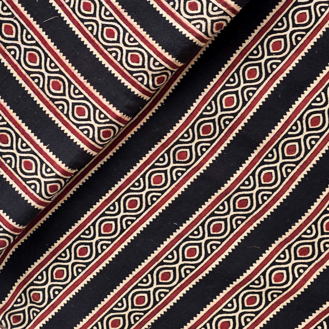 Pure Cotton Vegetable Dyed Ajrak Black With Cream And Red Intricate Border Stripes Hand Block Print Fabric