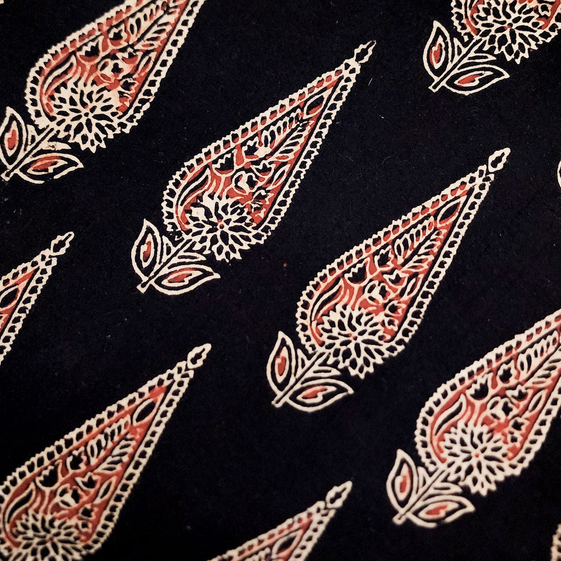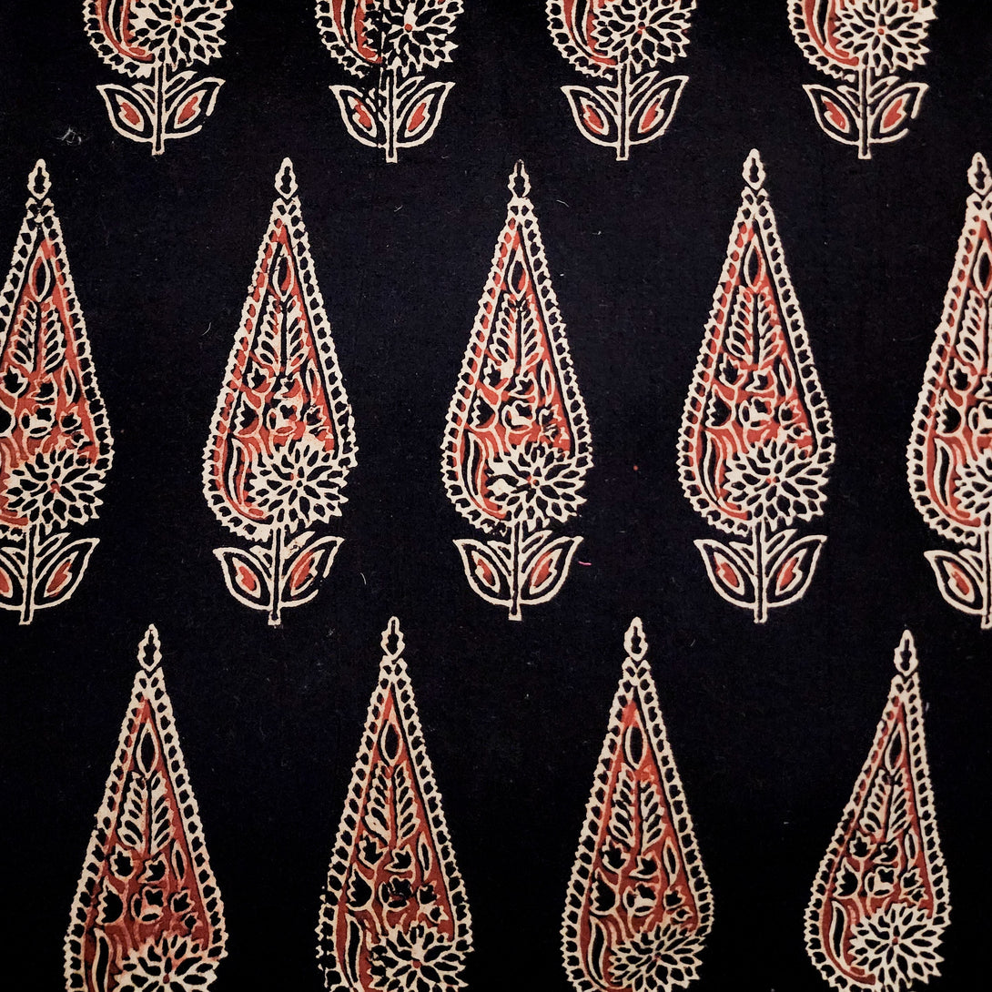 Pure Cotton Vegetable Dyed Ajrak Black With Cream And Rust Big Leafs Motifs Hand Block Print Fabric