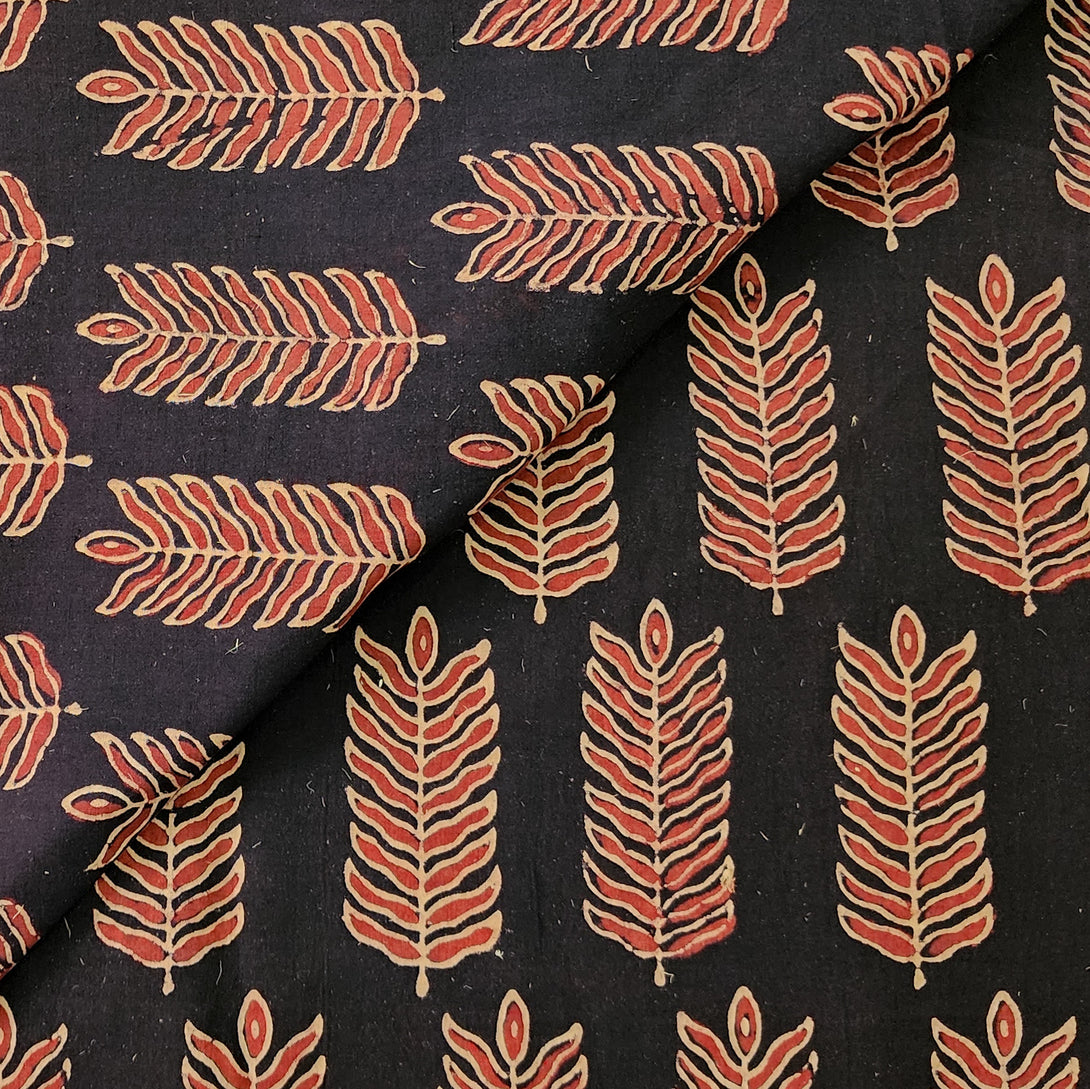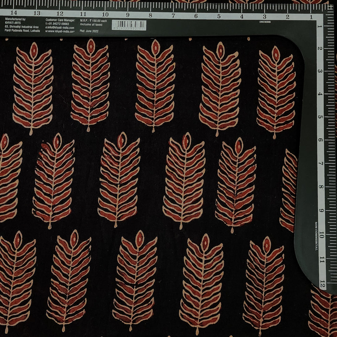 Pure Cotton Vegetable Dyed Ajrak Black With Rust Flower Plant Leaves Motif Hand Block Print Fabric