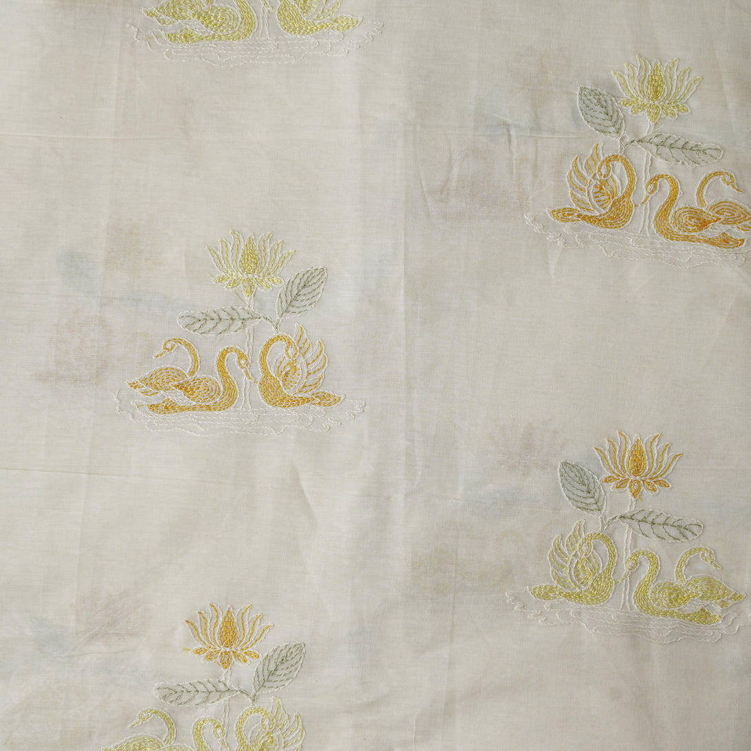 Pure Cotton Cream And Yellow Ducks In Pond With Lotus Motif Embroidery Fabric