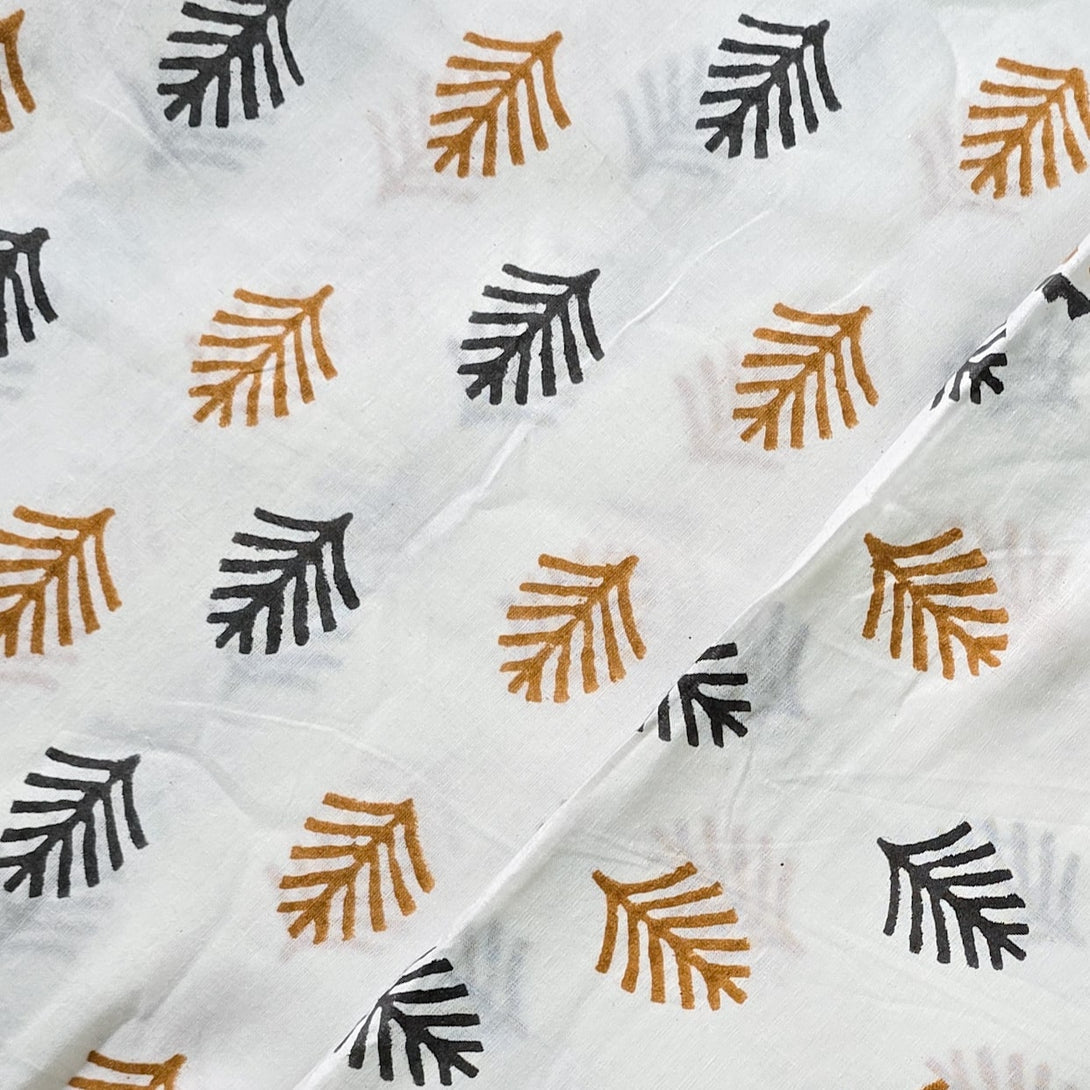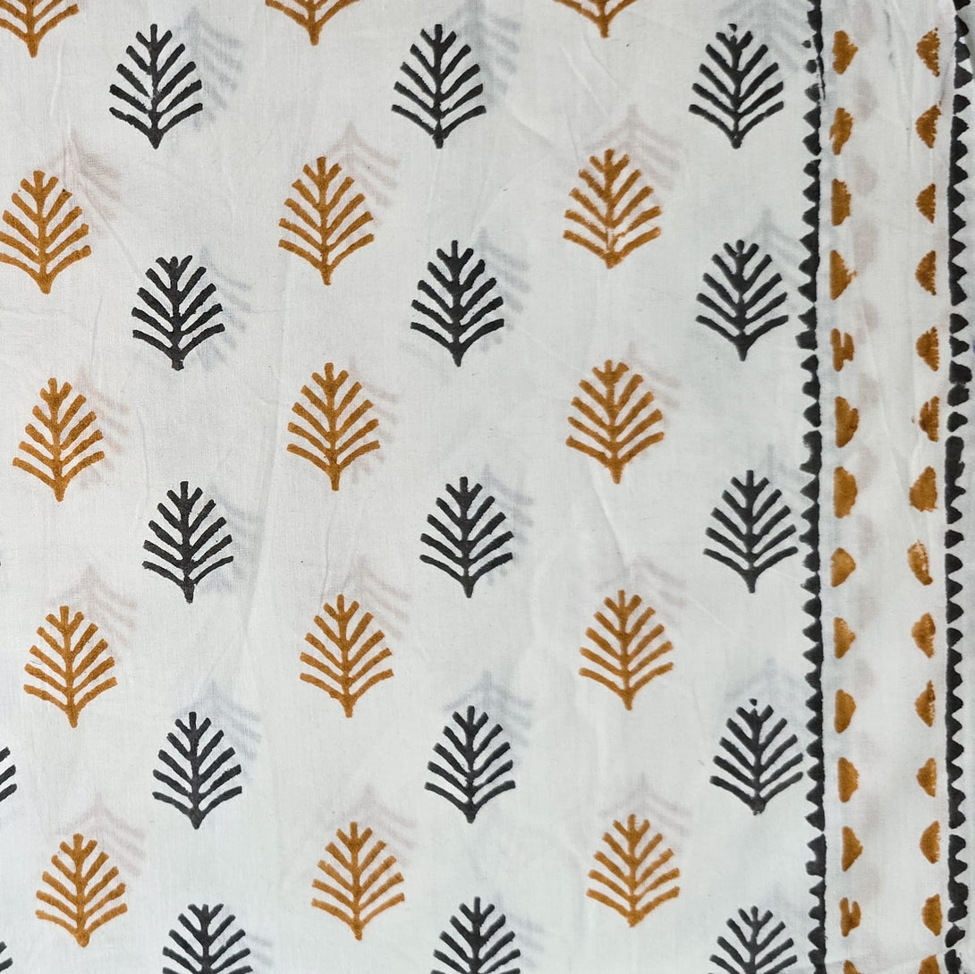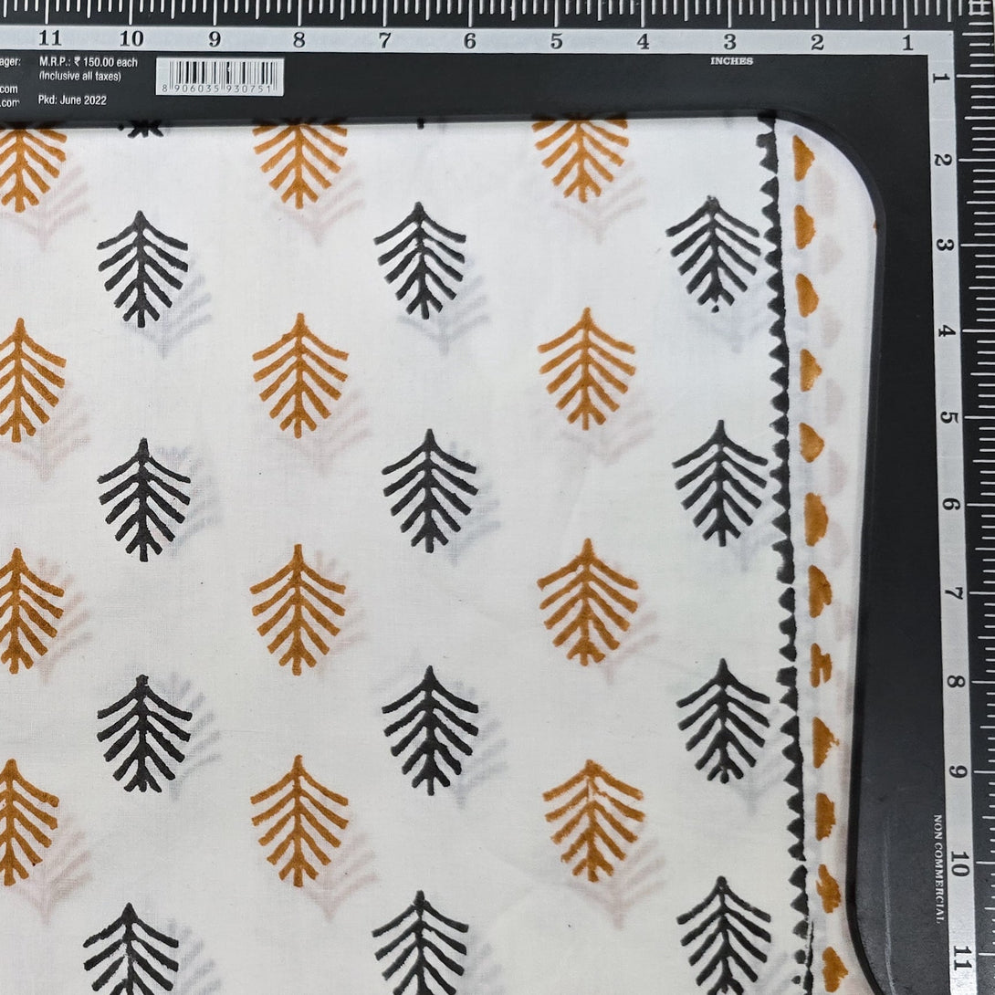 Pure Cotton White With Brown Black Small Leaves With Border Hand Block Print