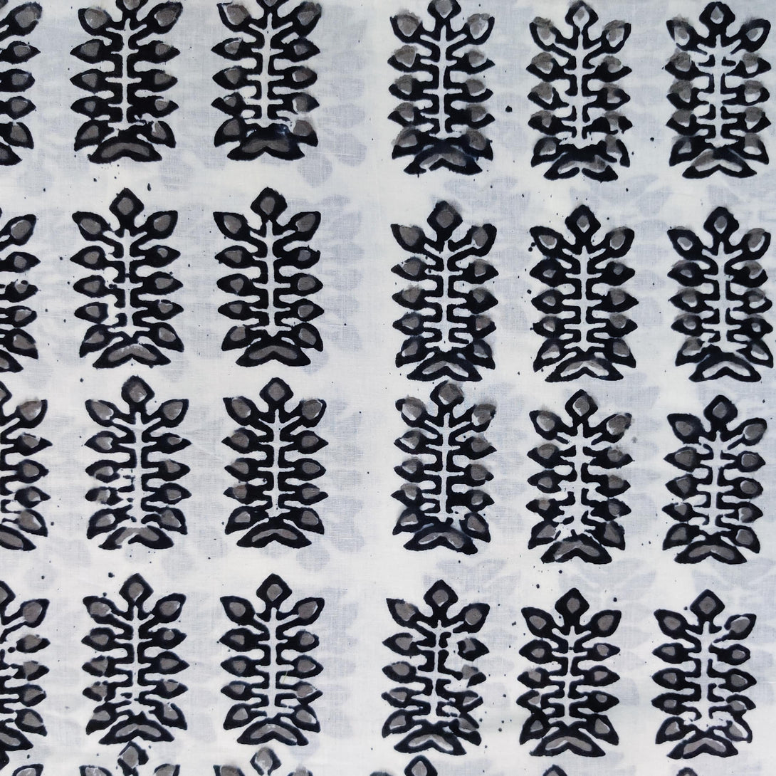 Pure Cotton White With Grey Black All Leaves Plant Hand Block Print Fabric