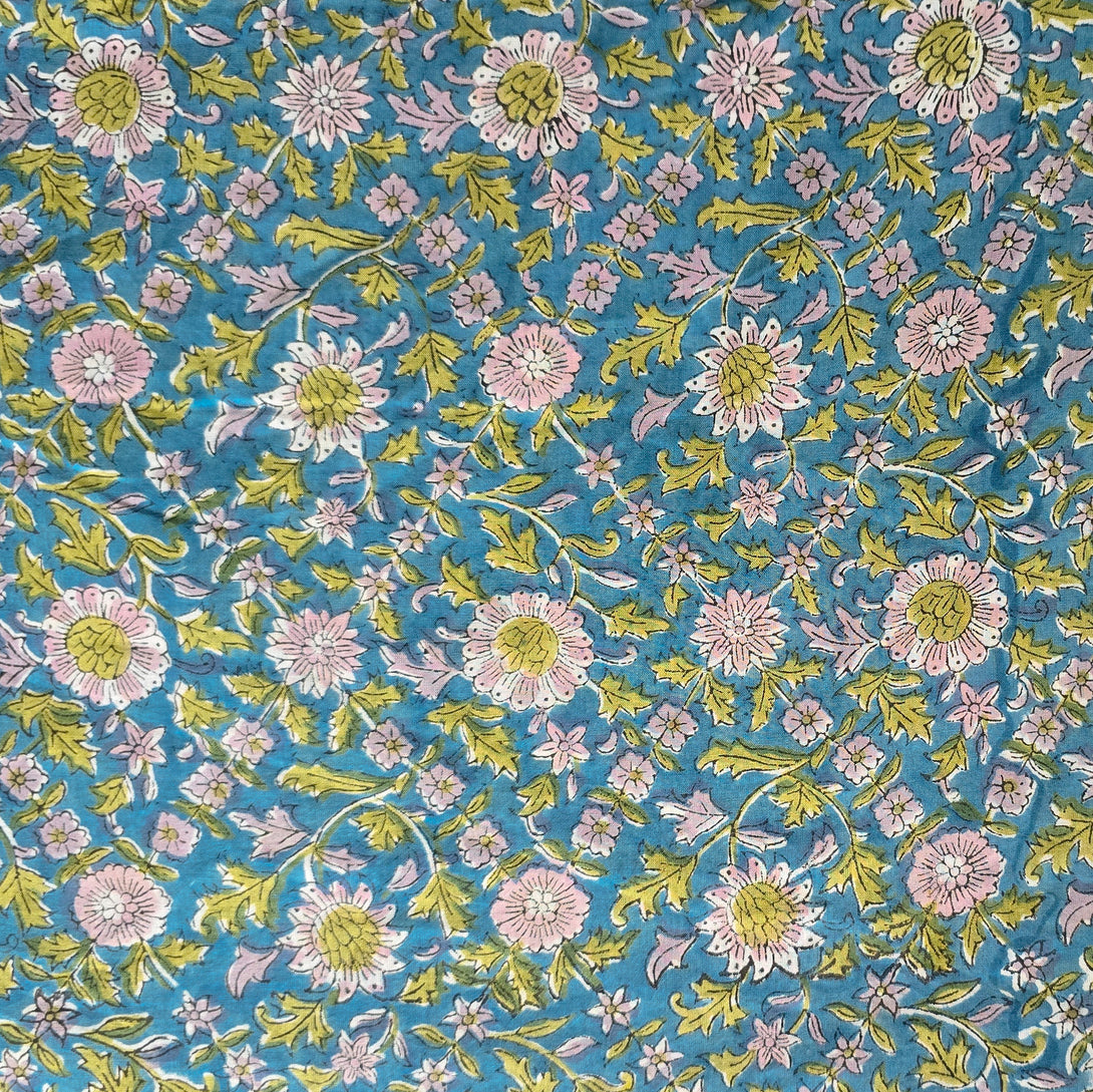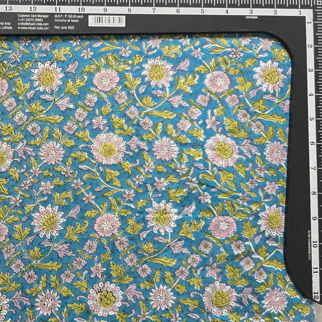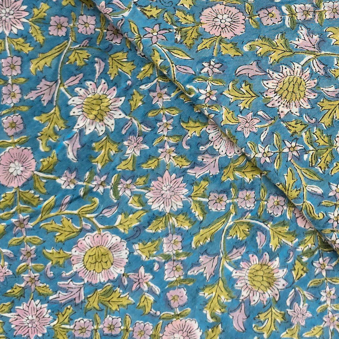 Pure Mul Cotton Jaipuri Blue With Light Pink Green Flowers Hand Block Print Fabric