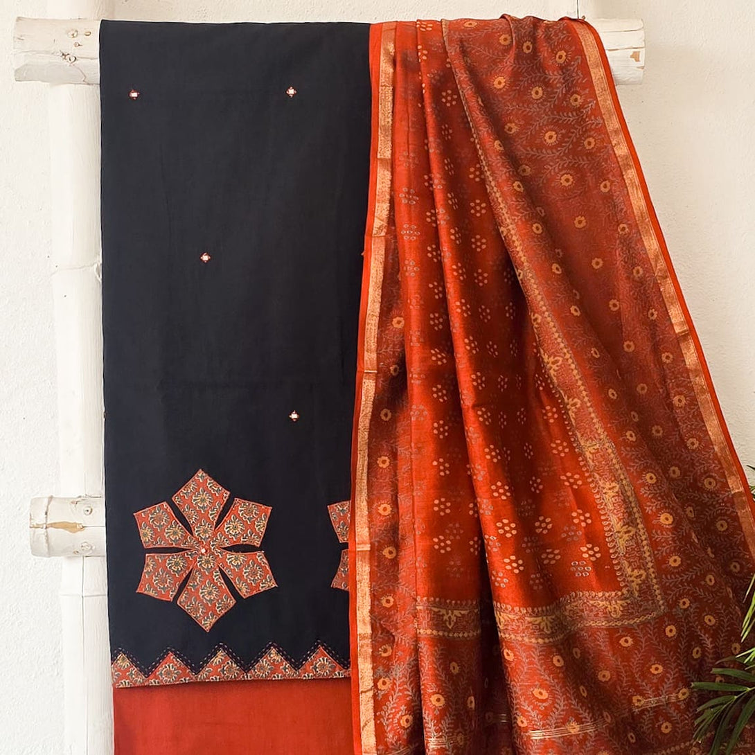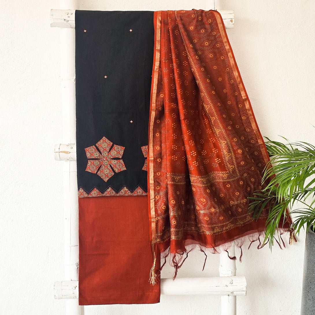 RAGINI -Pure Cotton Black With Rust Maroon Patchwork Yoke Suit