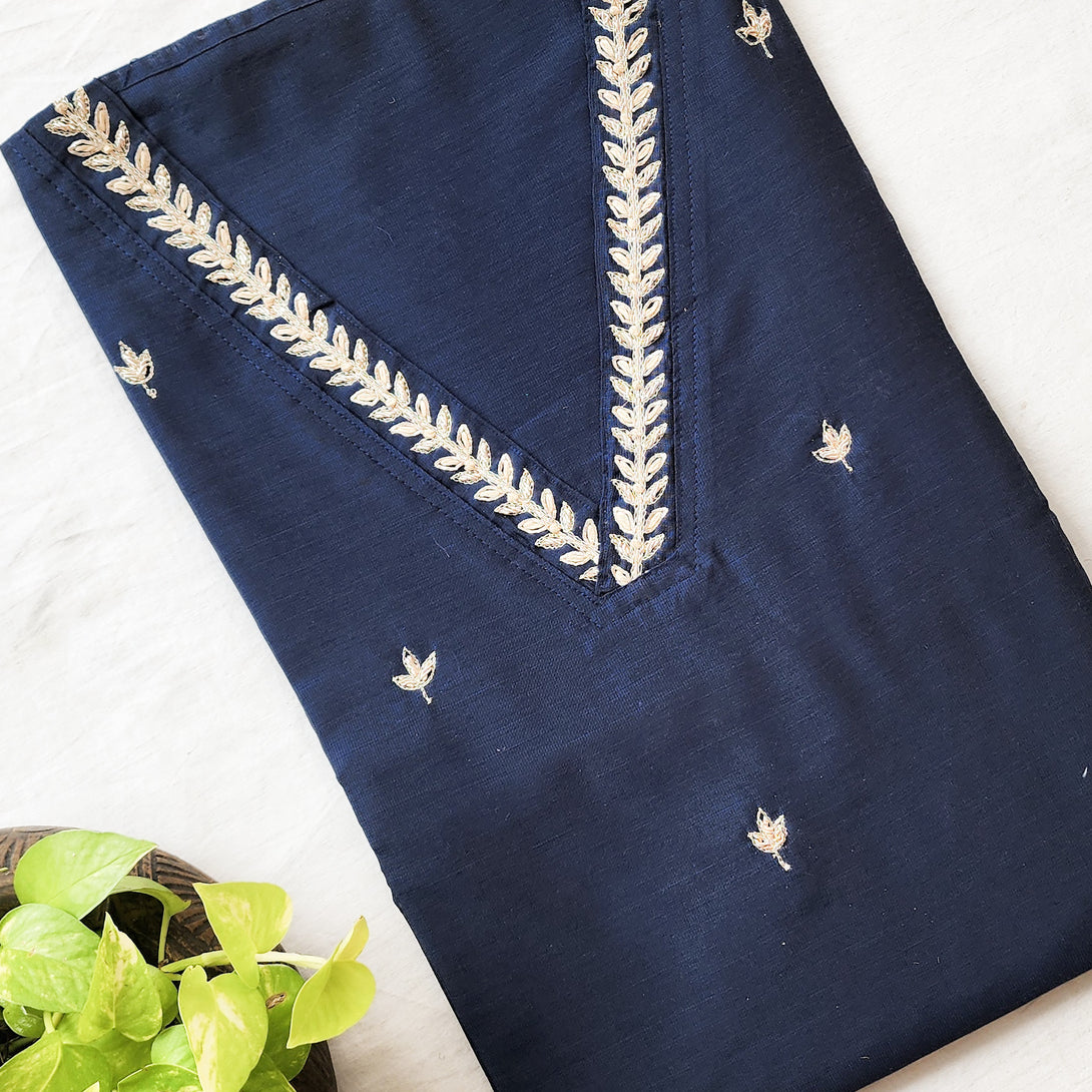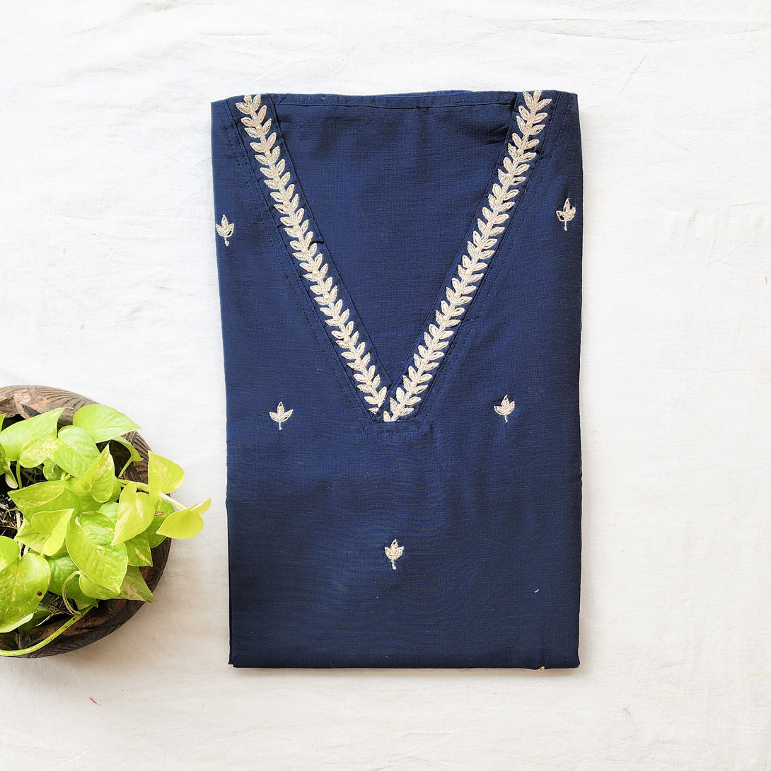 SHREYA-Cotton Silk Blue With Golden Embroiderey V Neck Pre-Designed Kurta
