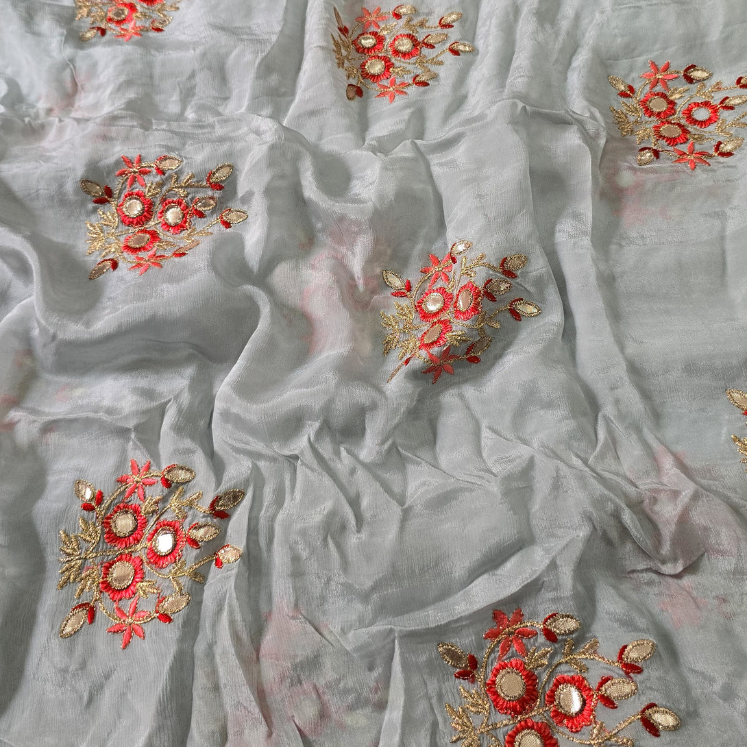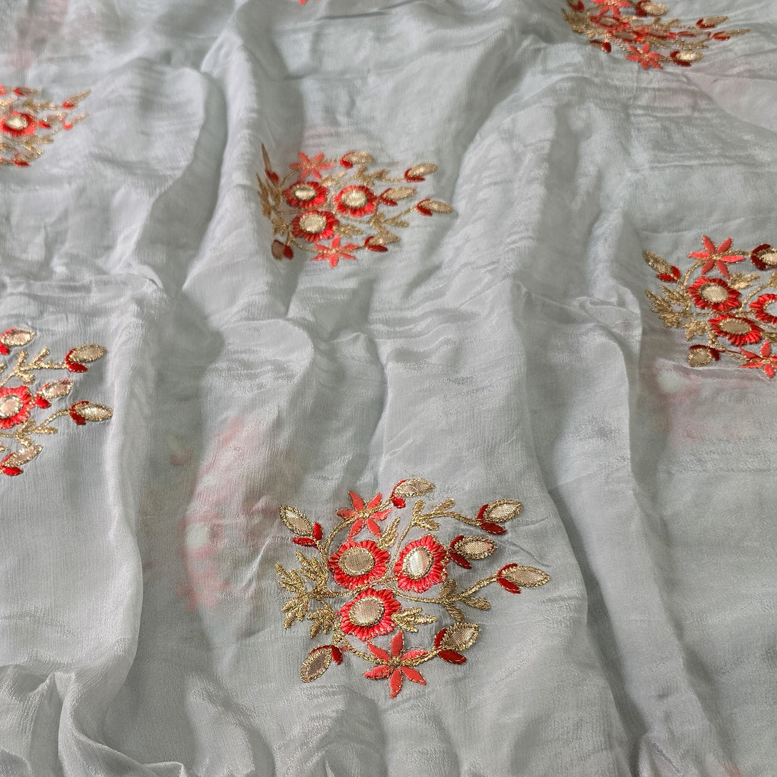 Silky Chinon Light Grey With Red Flower Emboiderey Fabric