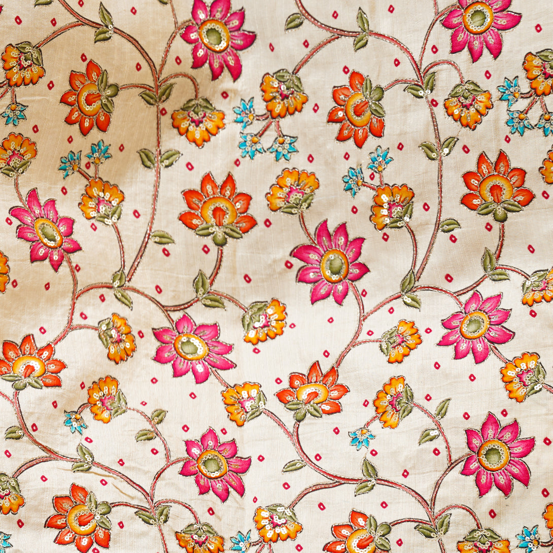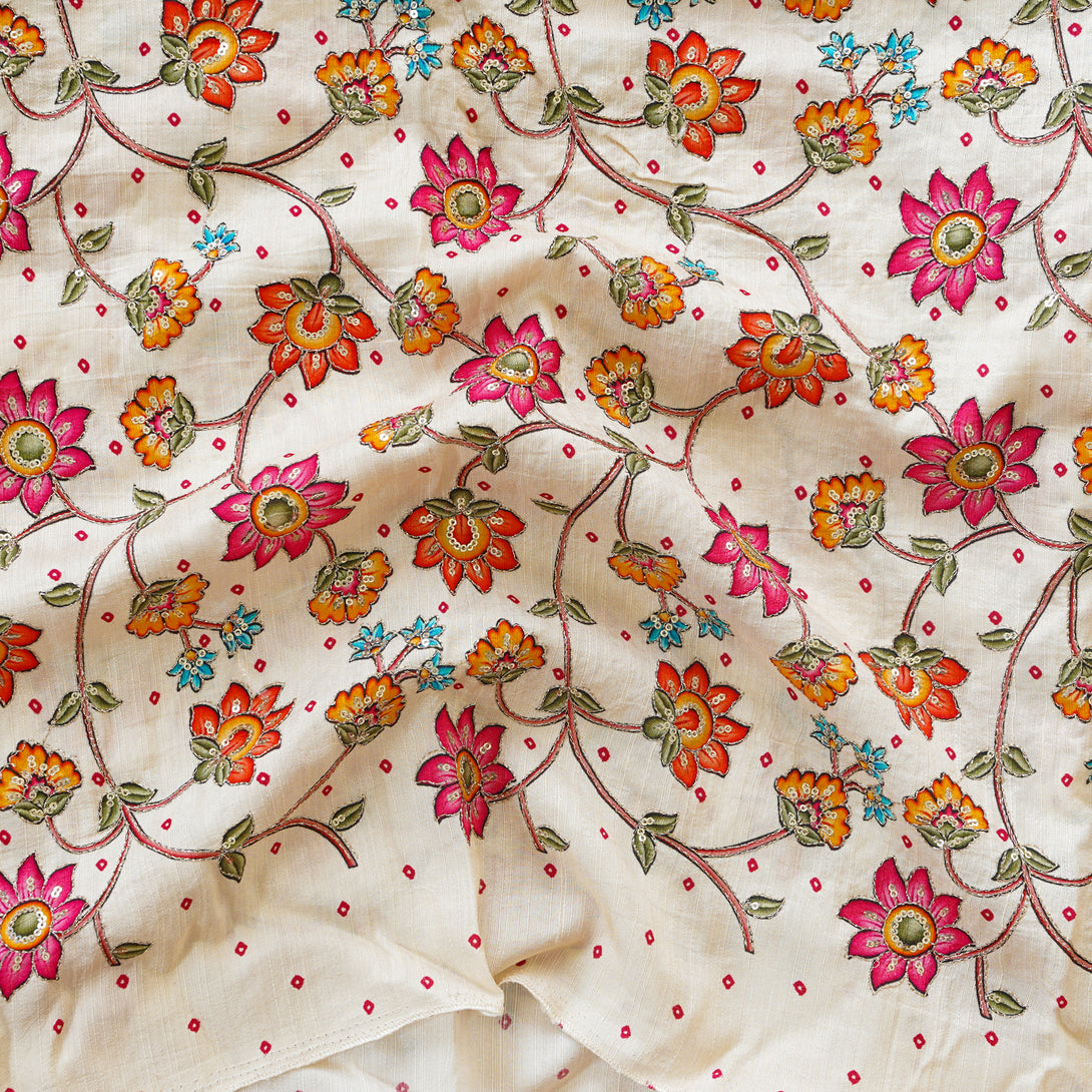 Soft Cotton Silk Cream With Flower Jaal Kalamkari Embroided Print Fabric