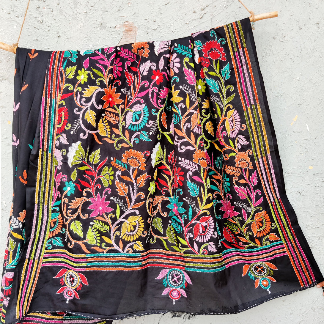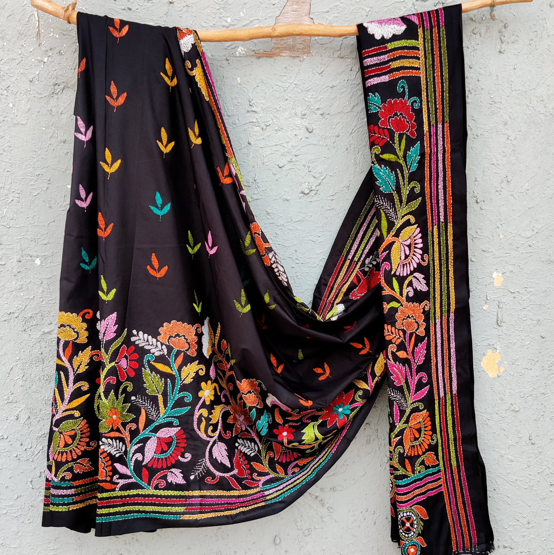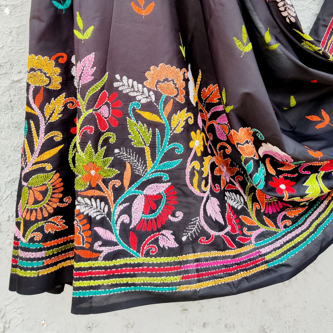 SUI DHAGA-Black Semi Bangalore Silk Saree Pink Blue And Orange Flower Jaal Hand Stitched Saree