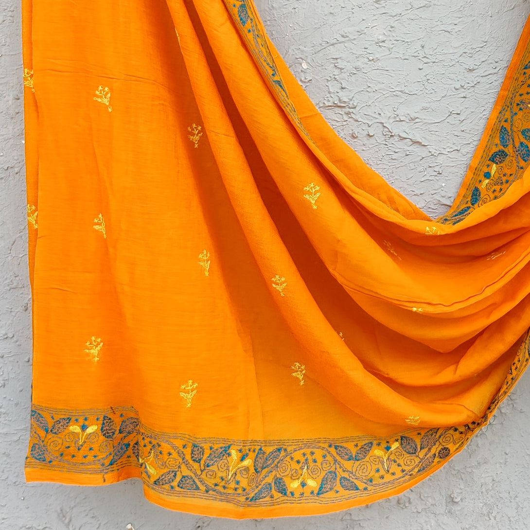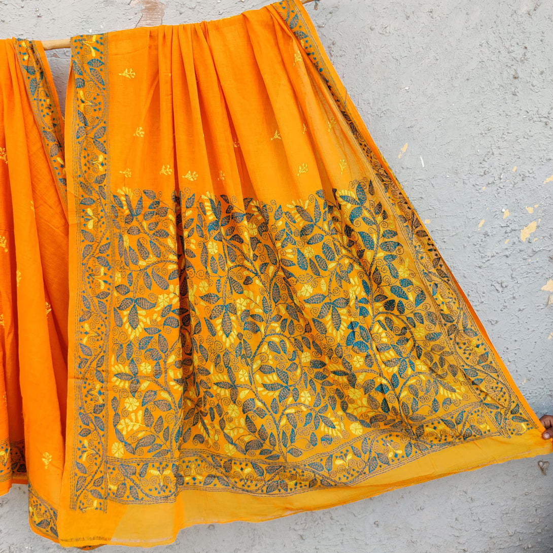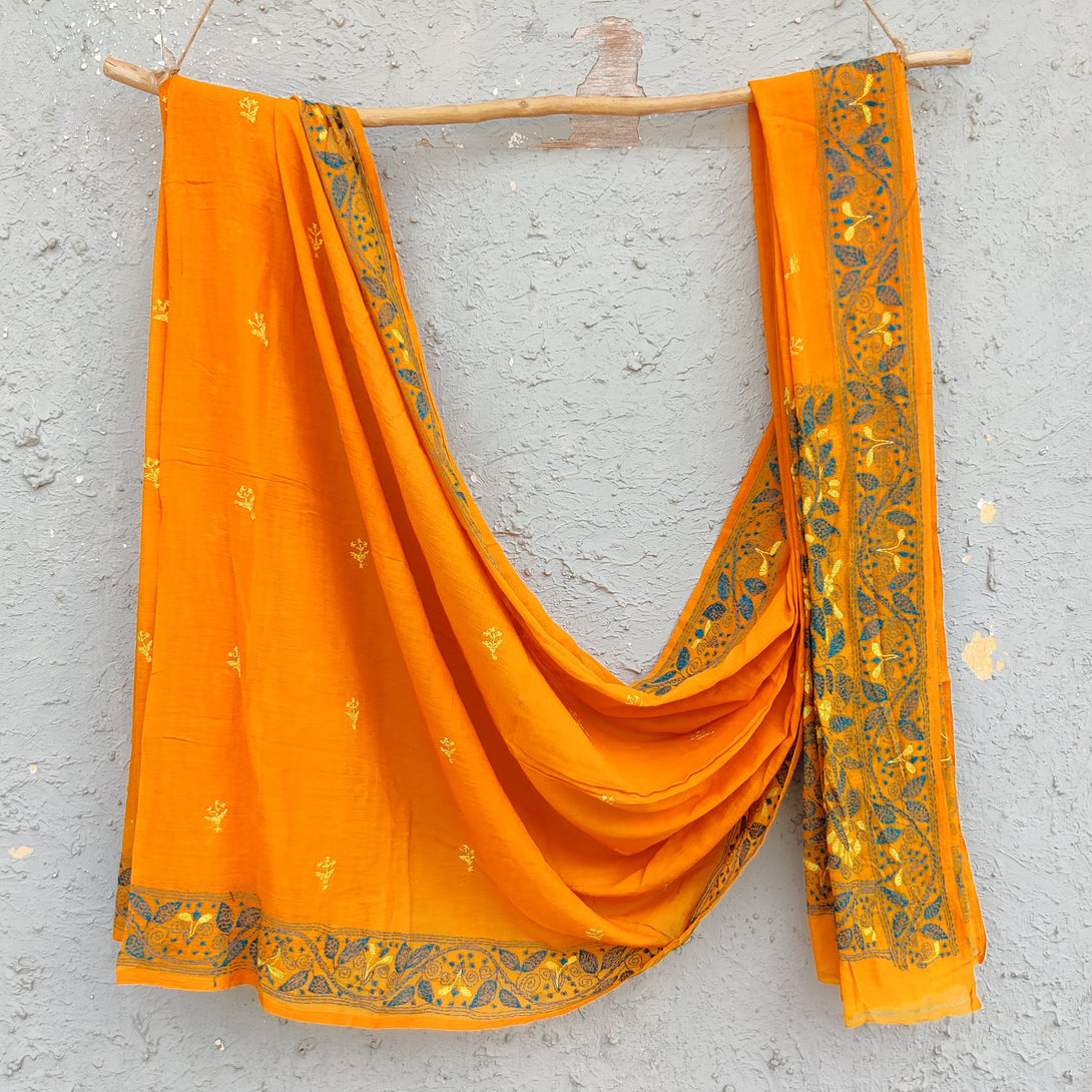 SUI DHAGA-Pure Bengal Mul Cotton Handmade Kaatha Work Saree Orange With Blue And Yellow