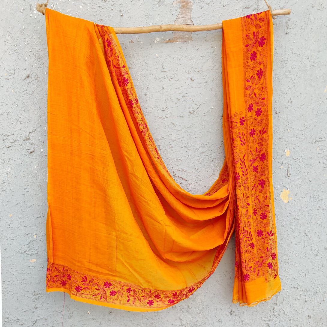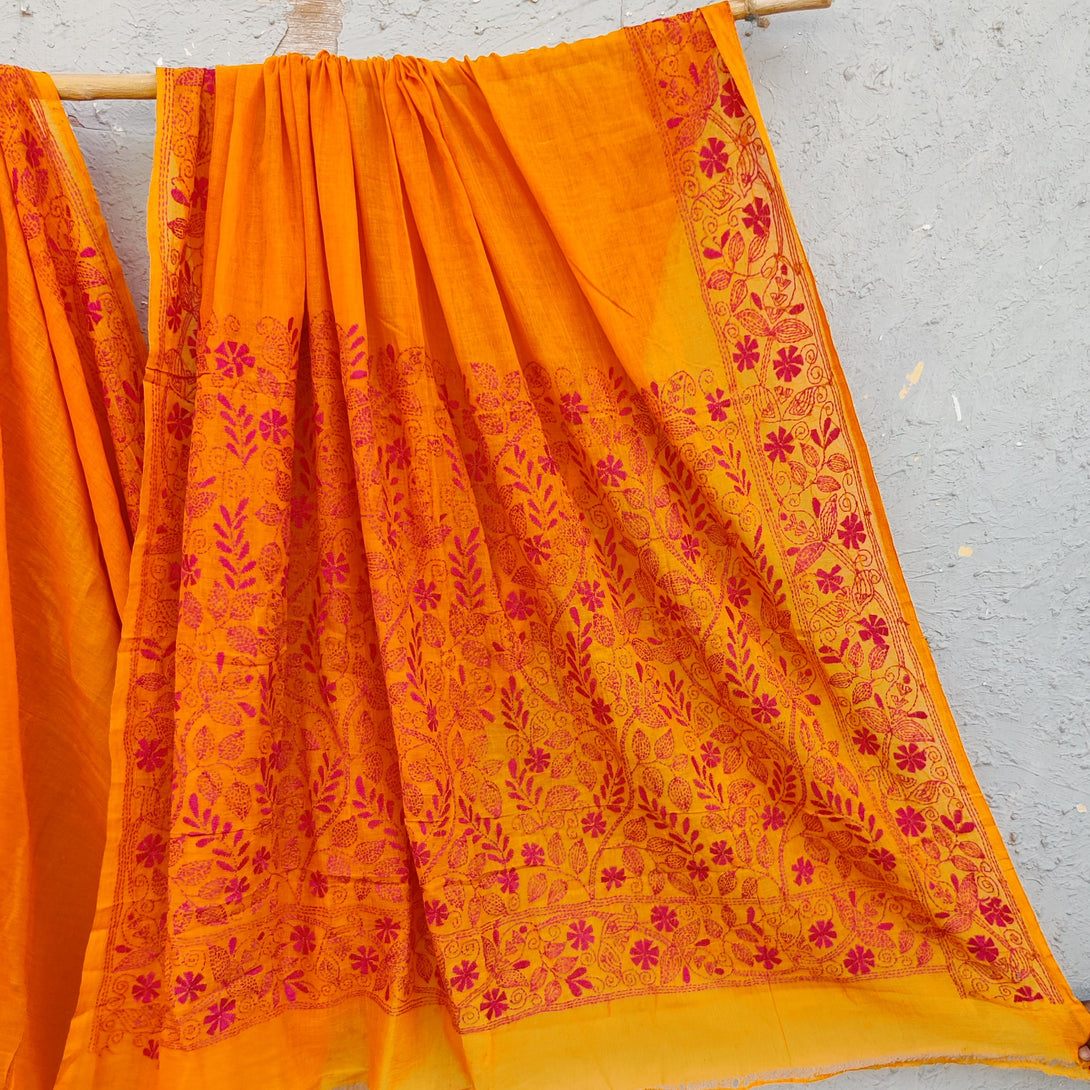 SUI DHAGA-Pure Bengal Mul Cotton Handmade Kaatha Work Saree Orange With Pink