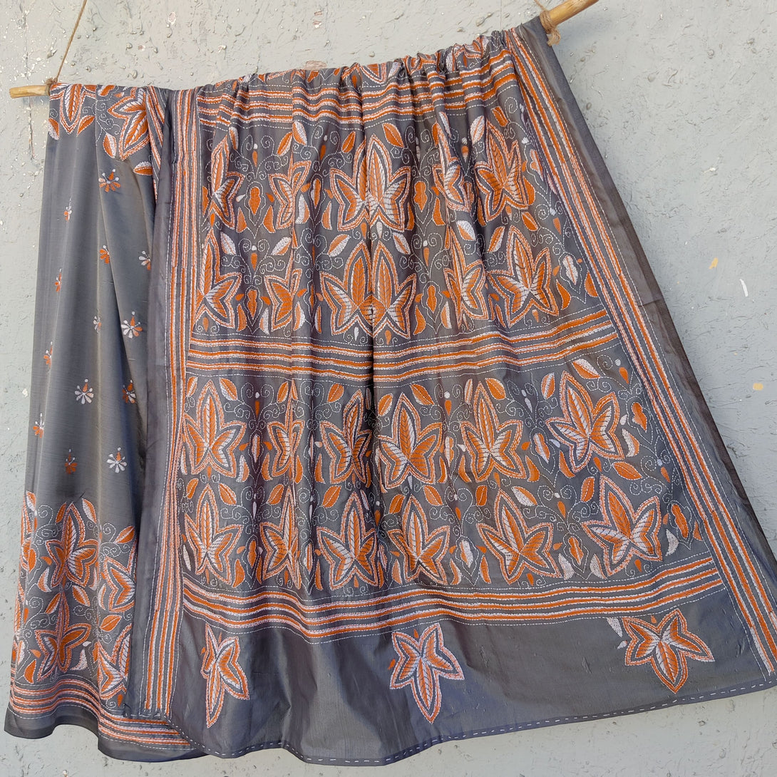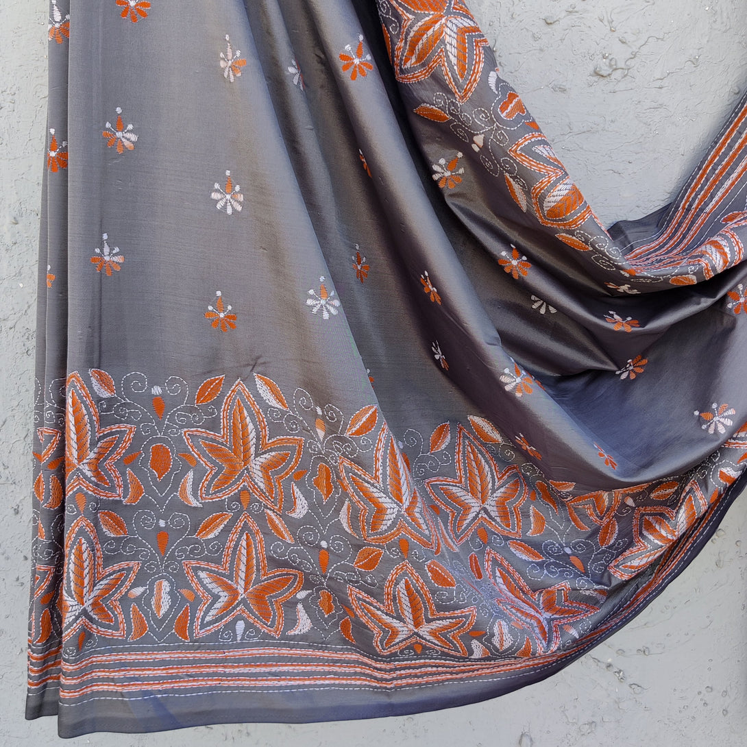 SUI DHAGA SPECIAL - Grey Semi Bangalore Silk Saree With Orange Cream IntricateLeaf Design Hand Stitched Saree