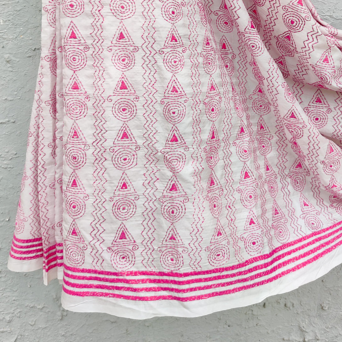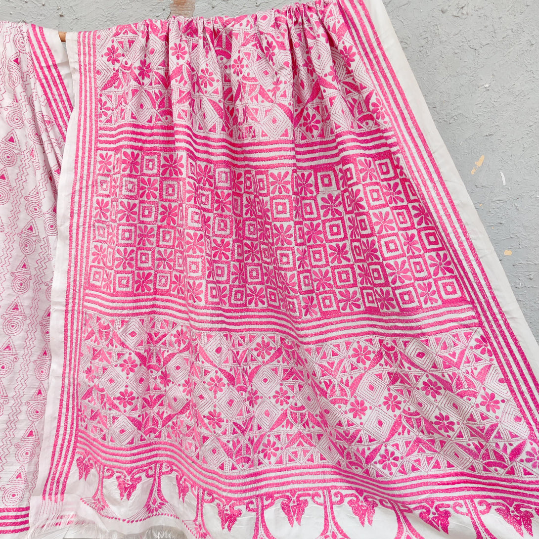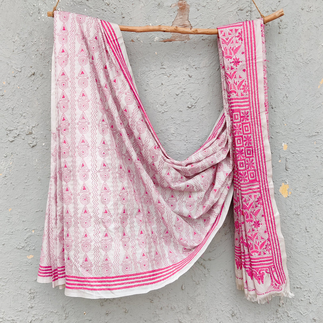 SUI DHAGA-White Semi Bangalore Silk Saree Pink Intricate Multi Colour All Over Tribal Pattern Hand Stitched Saree