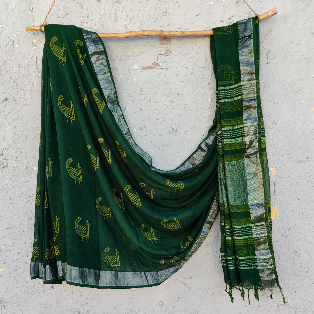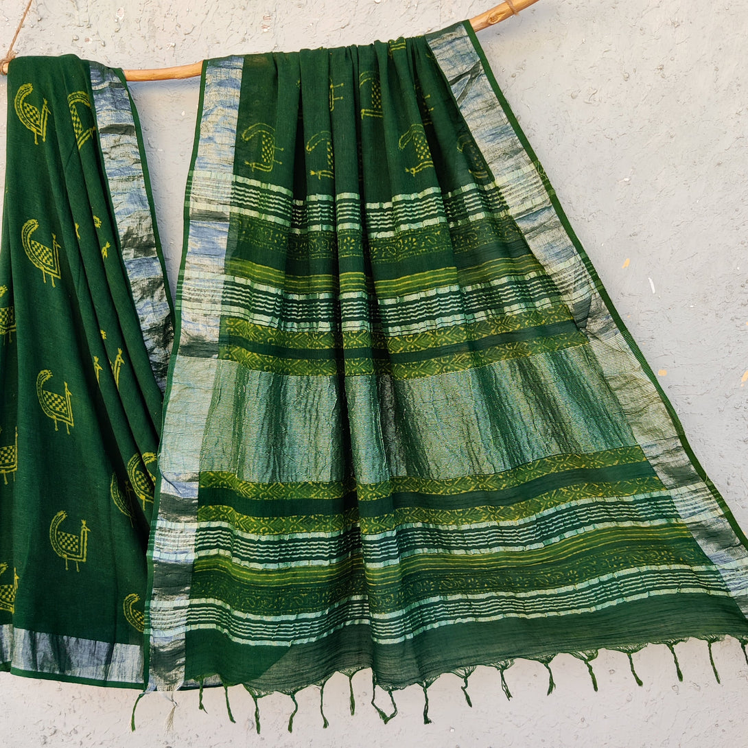 SUKOON - Linen Akola Dabu Green Peacock Saree