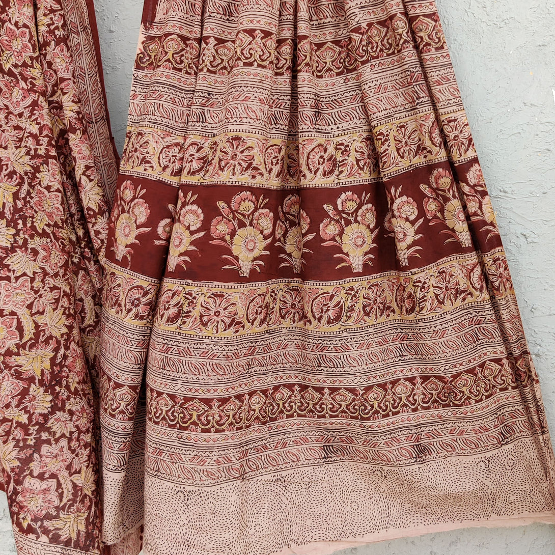SWARA - Pure Cotton Kalamkari Brown Saree With Peach Mustard Floral Jaal Hand Block Print Saree