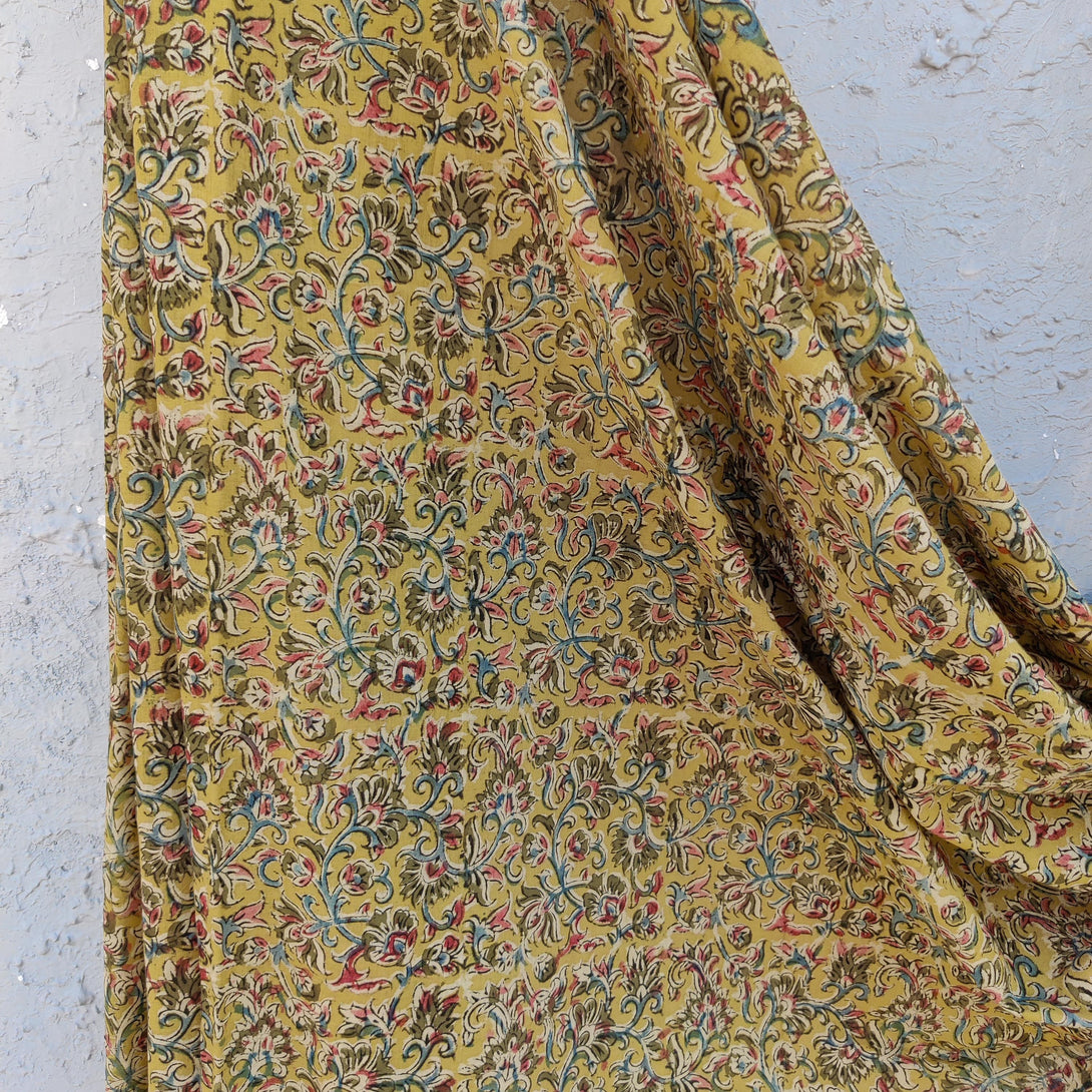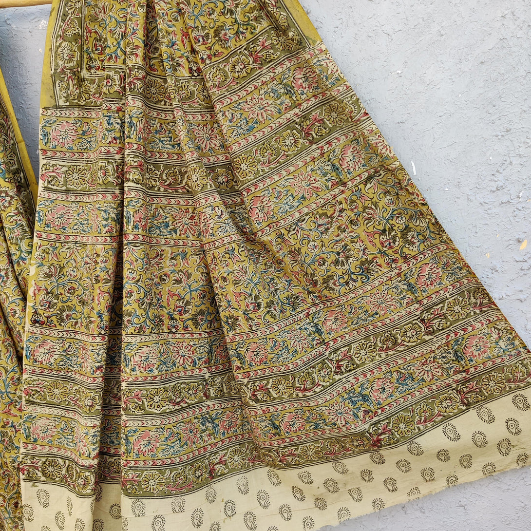 SWARA - Pure Cotton Kalamkari Mehendi Green Yellow With Floral Jaal Hand Block Print Saree