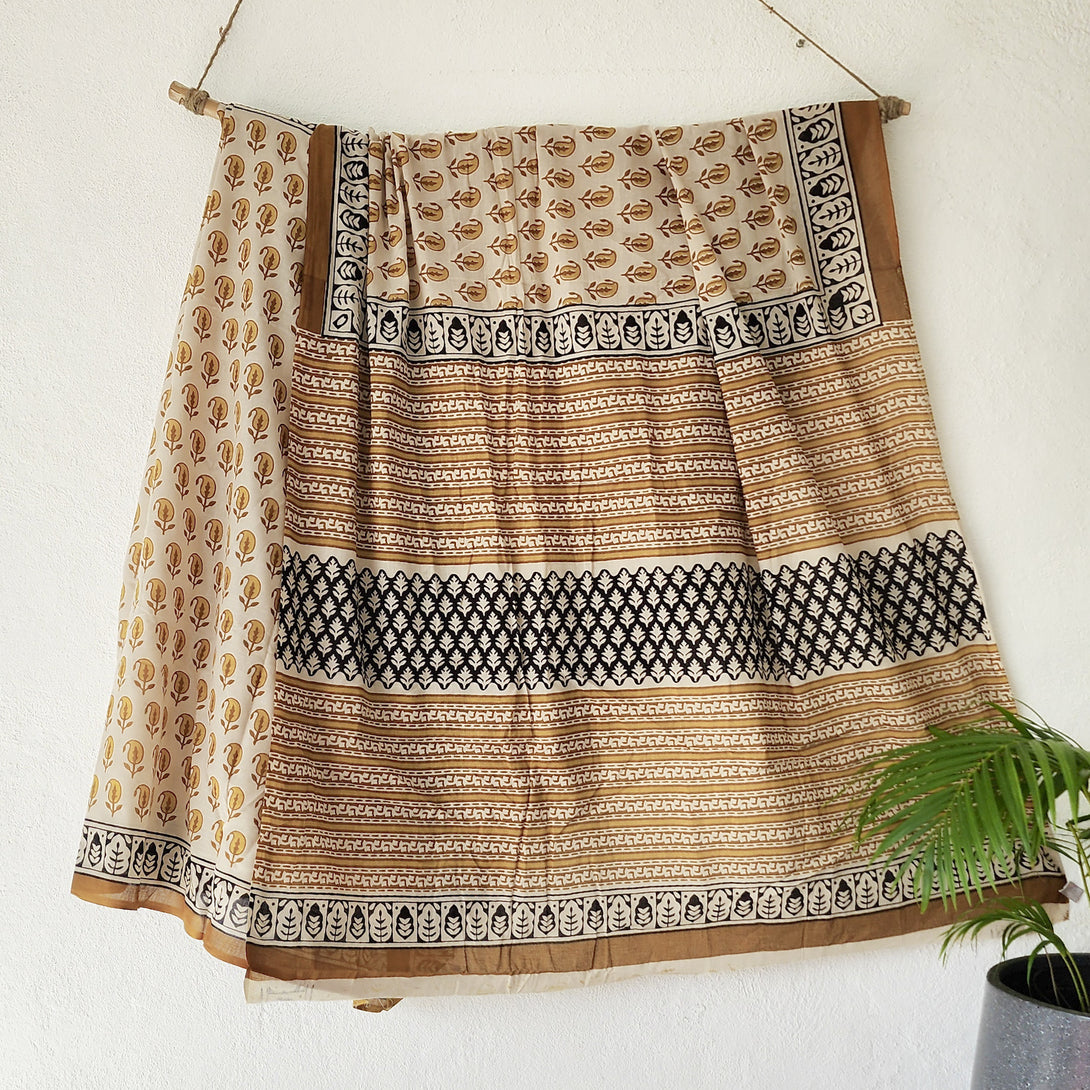 VEERA -Pure Mul Cotton Cream With Mustard Kairi Motif Hand Block Print Saree