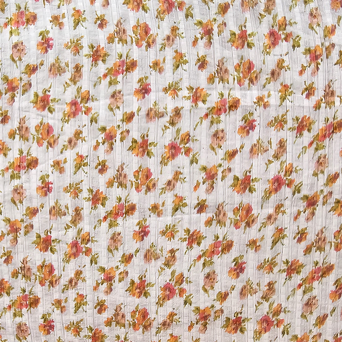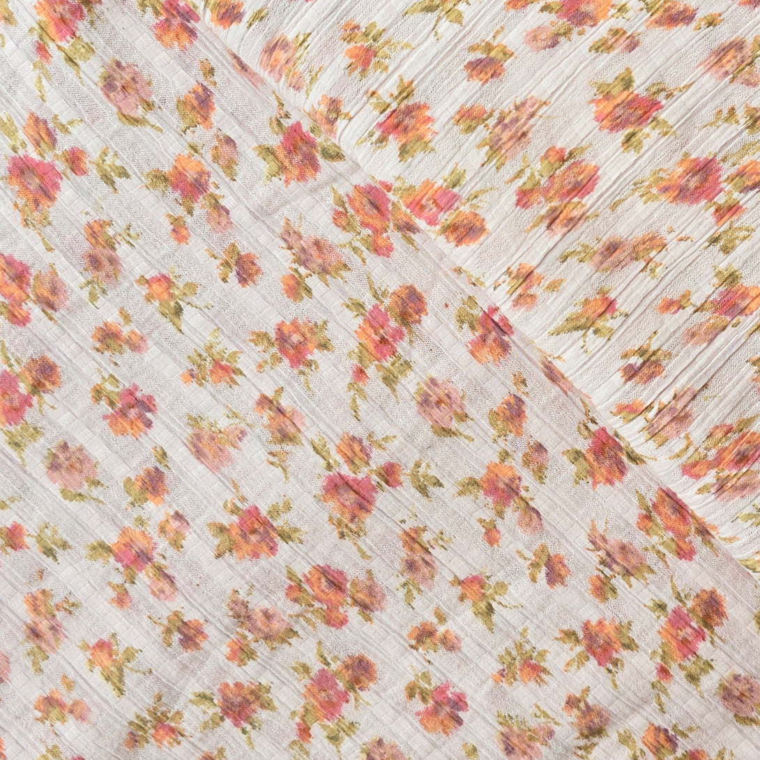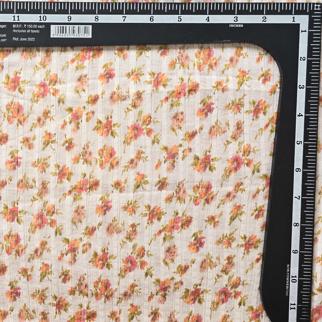 White And Peach With Orange Small Flower Motifs Crepe Cotton Blended Fabric