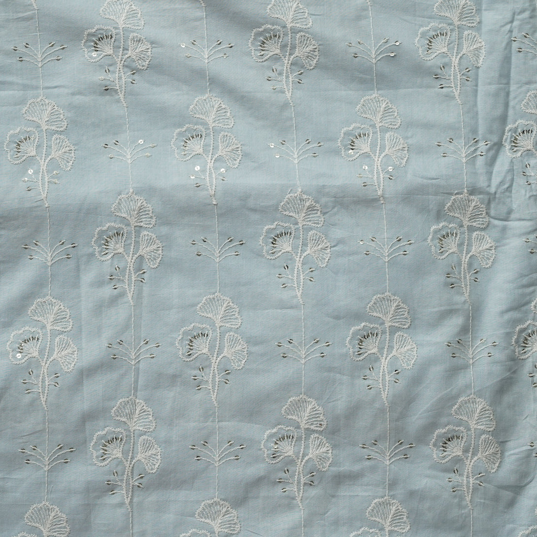 ( Width 41 Inches )Pure Cotton powder blue With White Flower Creeper Embroidered And Sequence Work Fabric
