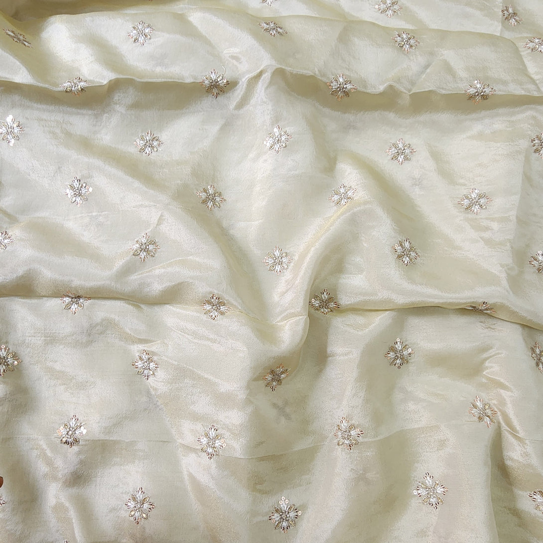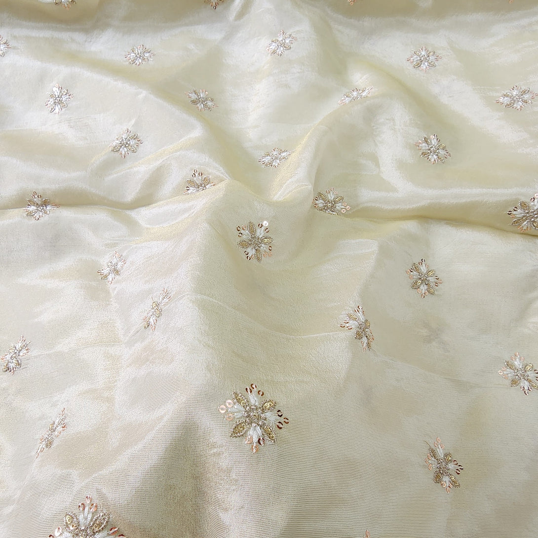 ( Width 46 Inches ) Emboiderey Tissue Cream Zari Intricate Work Flower Motif Hand Woven Fabric